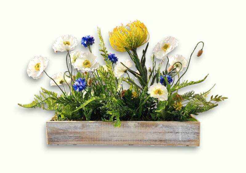Entdecken Sie die elegante Weiße Mohnwiese, arrangiert in einem Holzkasten. Kornblumen, Protea und Farn vereinen Farben und Strukturen harmonisch. Perfekt als Deko oder Geschenk bringt dieses Kunstwerk stilvolle Frische in jeden Raum. Lassen Sie sich von der zeitlosen Ästhetik der Natur begeistern!