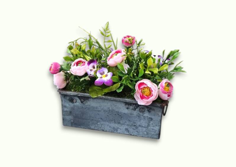 Holen Sie sich Frühlings-Eleganz ins Haus mit unserem Ranunkel Kasten aus hochwertigen Seidenblumen, bestückt mit Stiefmütterchen und Hornveilchen. Pflegeleicht, langlebig und perfekt für stilvolle Deko auf Tisch, Fensterbank oder im Wohnraum. Frühlingsflair das ganze Jahr!