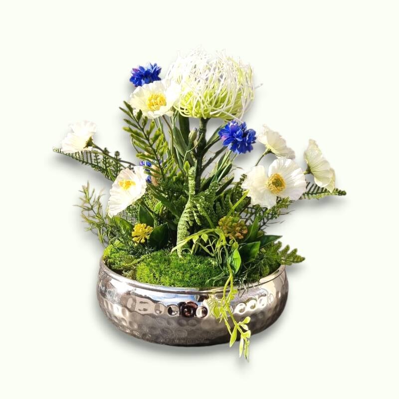 Erleben Sie den "Weißen Mohntraum": Zarte weiße Mohnblüten mit edlem Moos, stilvoll in einer silbernen Schale arrangiert. Farbige Akzente durch Kornblumen, Protea und Farnblätter verleihen Eleganz – ideal als Tischdekoration, Geschenk oder Highlight. Lassen Sie sich verzaubern!
