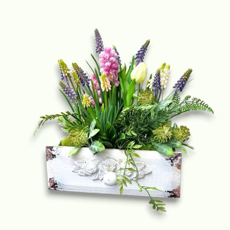 Holen Sie sich den Frühling nach Hause – mit Hyazinthen in einer rustikalen Schublade! Die Farben der Blumen bringen Frische, während die Schublade den Landhausstil betont. Ideal als Tischdeko, Blickfang oder besonderes Geschenk. Lassen Sie den Frühling einziehen!