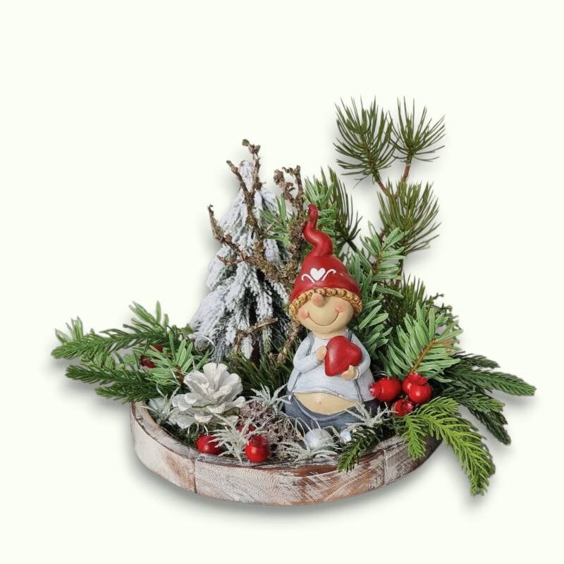 Dieses zauberhafte Gesteck erzählt eine liebevolle Geschichte. Ein Wichtelmann mit Herz steht für Zuneigung und Verbundenheit. Eingebettet in eine stimmungsvolle Waldkulisse, schafft es eine besondere Atmosphäre – ideal als Geschenk oder dekorativer Akzent für Zuhause.