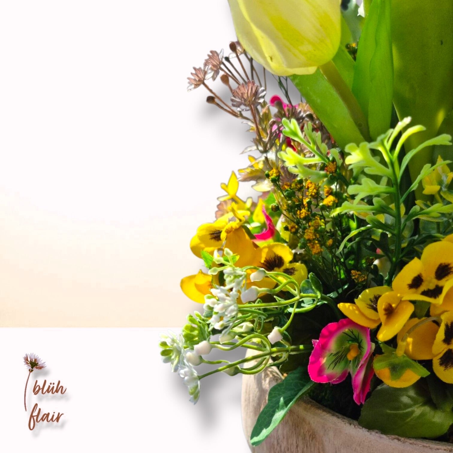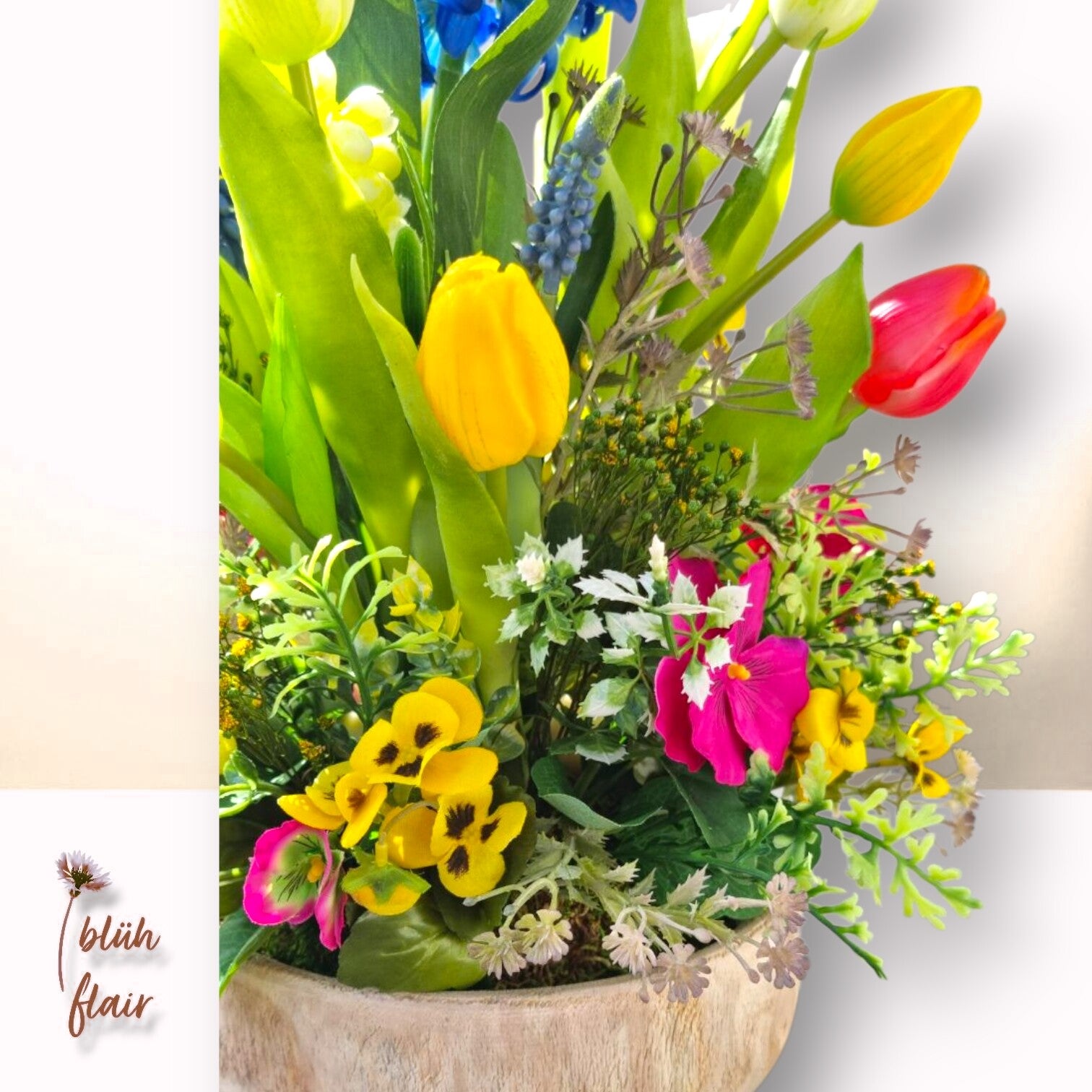 Seidenblumen Arrangement: Tulpen Gesteck in Holzschale - Osterzeit - ⌀32xH46