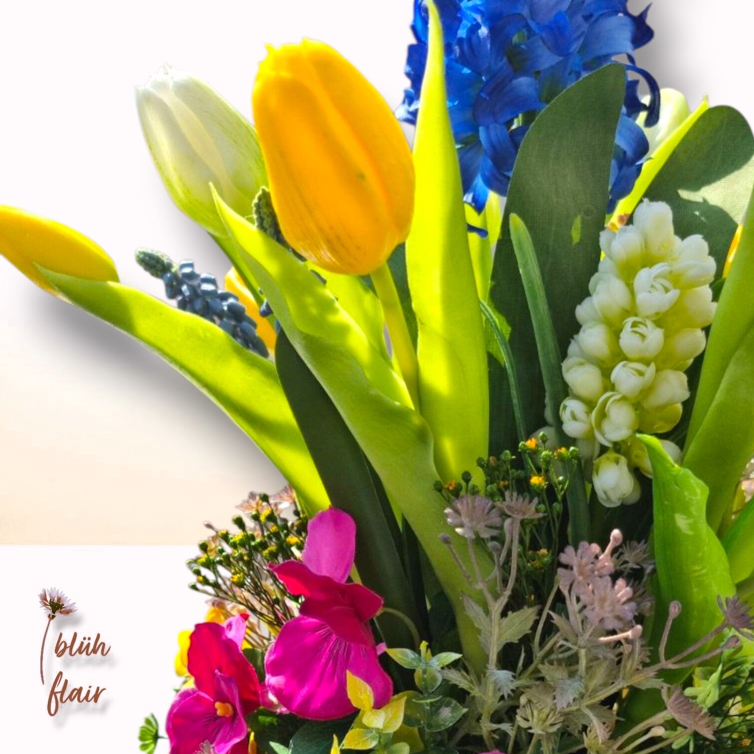 Ein wunderschönes Tulpengesteck bestehend aus gelben / weißen Tulpen, einer blauen Hyazinthe, blauen Traubenhyazinthen, pinkfarbenen Stiefmütterchen, gelben Hornveilchen und diversen Frühlingsblühern, vereint in einer runden Holzschale.