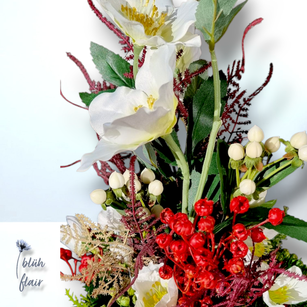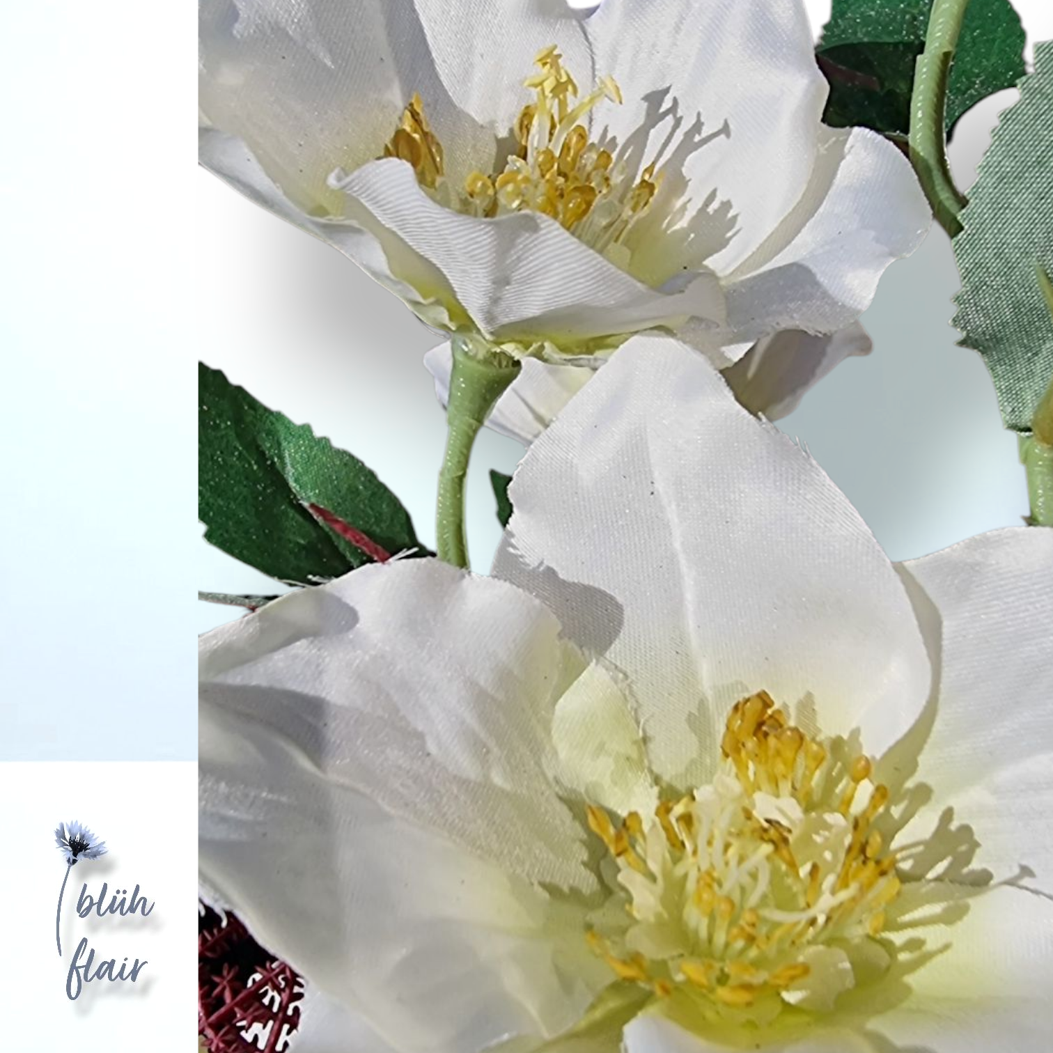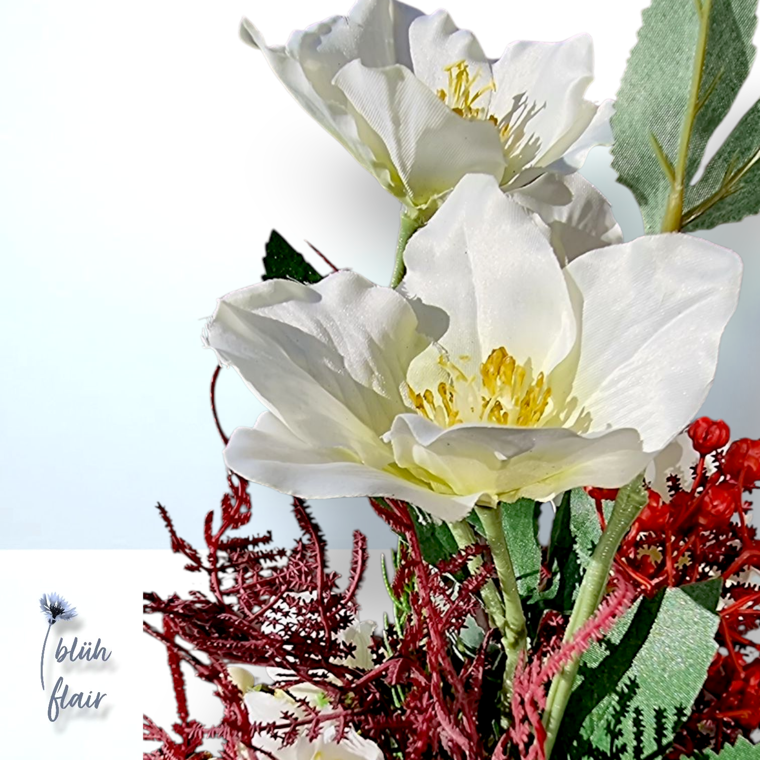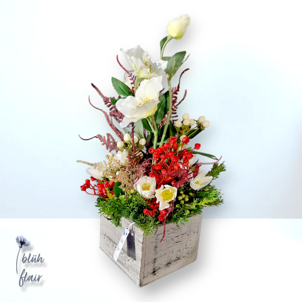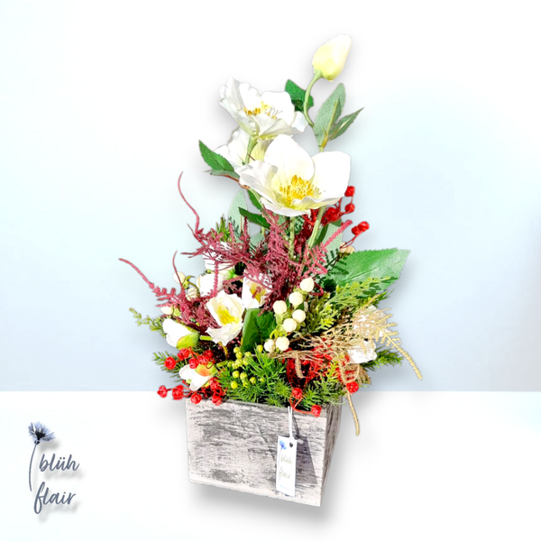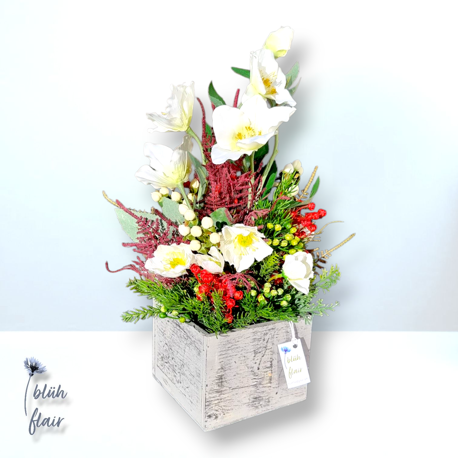 Seidenblumen Arrangement: Christrosen Gesteck im Holzkasten - Christzauber - L30xB30xH41