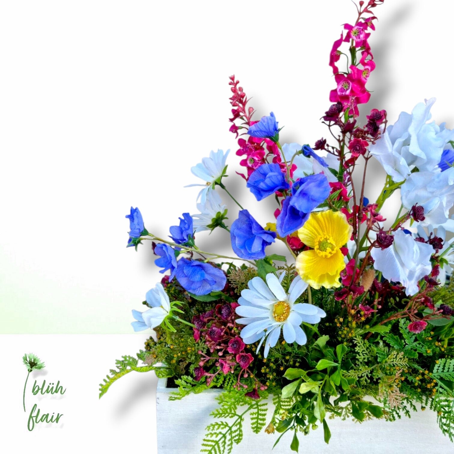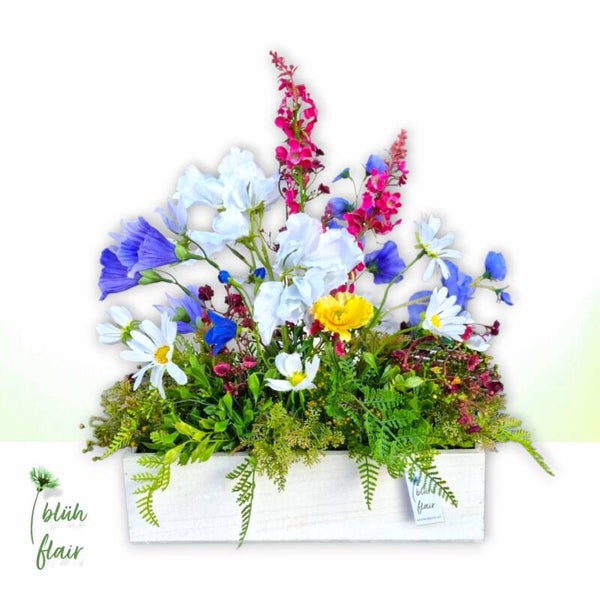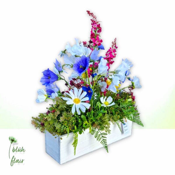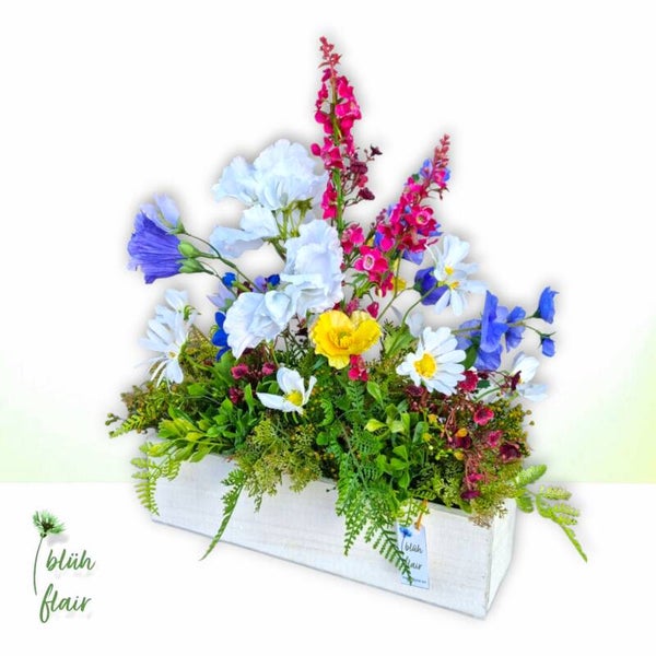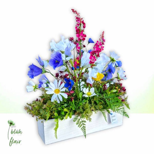 Die blaue Sommerwiese spiegelt die Magie der Natur wider: Blaue Glockenblumen und Wicken verschmelzen perfekt und werden von strahlend weißen Margeriten eingerahmt. Gelber Mohn und pinkfarbener Rittersporn setzen fröhliche Farbakzente und runden das Arrangement ab. Präsentiert in einem weißen Holzgefäß entsteht ein natürliches, stimmungsvolles Bild, das die Schönheit des Sommers widerspiegelt.