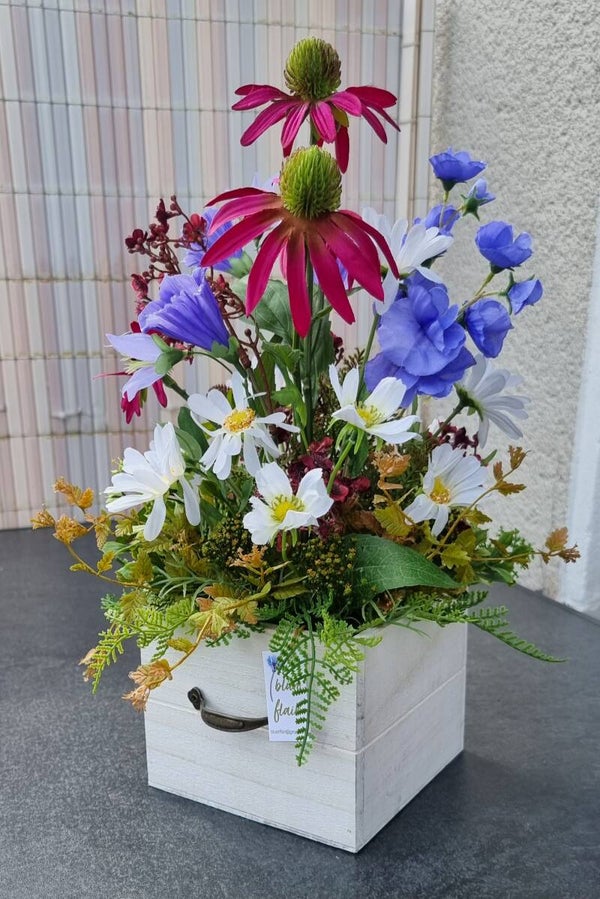 Seidenblumen Arrangement: Sommer Blumengesteck im Holzgefäß - Große blaue Sommerwiese - L26xB26xH42