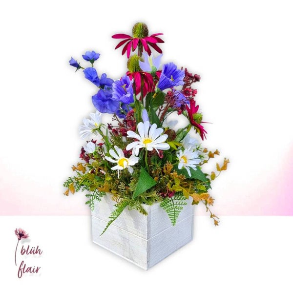 Die blaue Sommerwiese verkörpert die zauberhafte Pracht der Natur: Zarte blaue Glockenblumen und Wicken harmonieren wunderbar miteinander, eingerahmt von leuchtend weißen Margeriten. Pinkfarbene Sommerhüte setzen lebendige Farbakzente und vervollständigen das Arrangement mit einem fröhlichen Touch. Präsentiert in einem schlichten weißen Holzgefäß entsteht ein stimmungsvolles, natürliches Bild, das die Essenz und Schönheit des Sommers eindrucksvoll zur Geltung bringt.