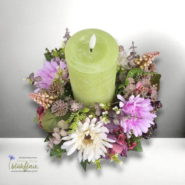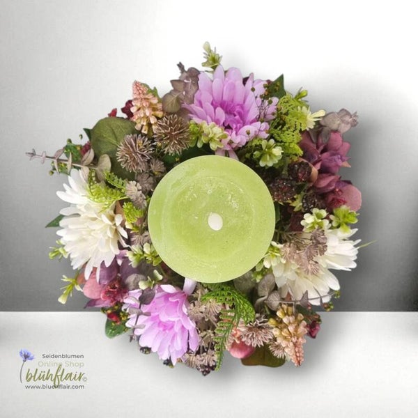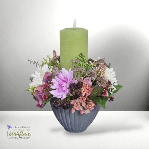 Seidenblumen Arrangement: Herbstgesteck mit Kerze - Herbstlicht Nr.2 - ⌀27xH32