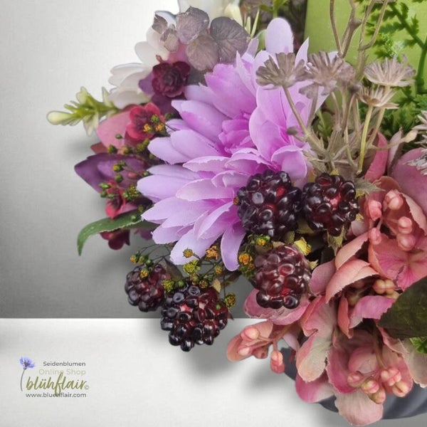 Das Herbstlicht Nr.2 besteht aus vier Gerbera in Violett und Weiß, grün-violetten Hortensien, dekorativen Herbst-Elementen und zarten Brombeerzweigen. Es wird durch eine hellgrüne Kerze ergänzt und in einem grauen Kunststoffgefäß arrangiert. Dieses Gesteck ist perfekt für die Herbstzeit geeignet.