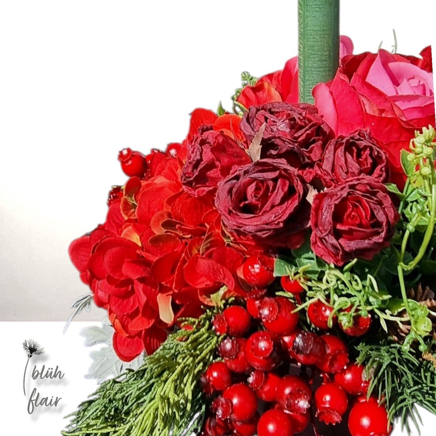 Das Gesteck Winterzeit besteht aus roten Rosen, einer roten Hortensie und Beeren. Ergänzt wird es durch künstliche Tannenzweige mit Zapfen. Eine grüne Kerze sorgt für die passende Winterstimmung. Das Arrangement ist in einer rot-matten Kunststoffschale dekoriert.