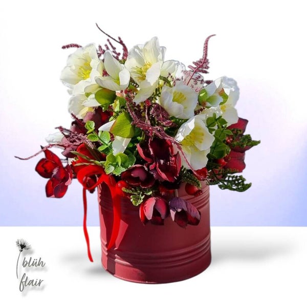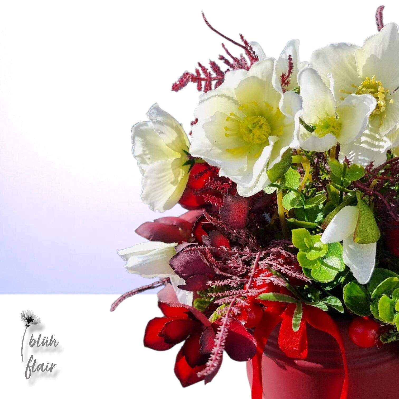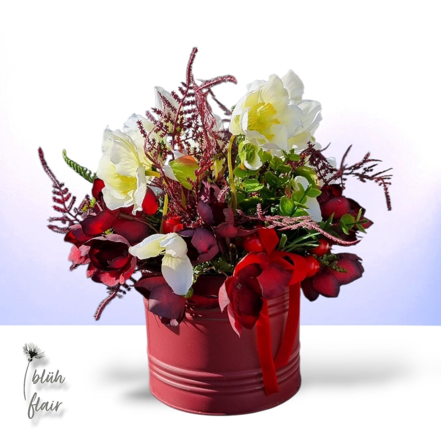 Die kleine Winterfreude besteht aus weißen Christrosen und dunkelroten Hortensien mit Beeren. Ergänzt wird das Arrangement durch künstlichen Buchsbaum und Farn. Alles ist in einer roten Blechdose dekorativ arrangiert.
