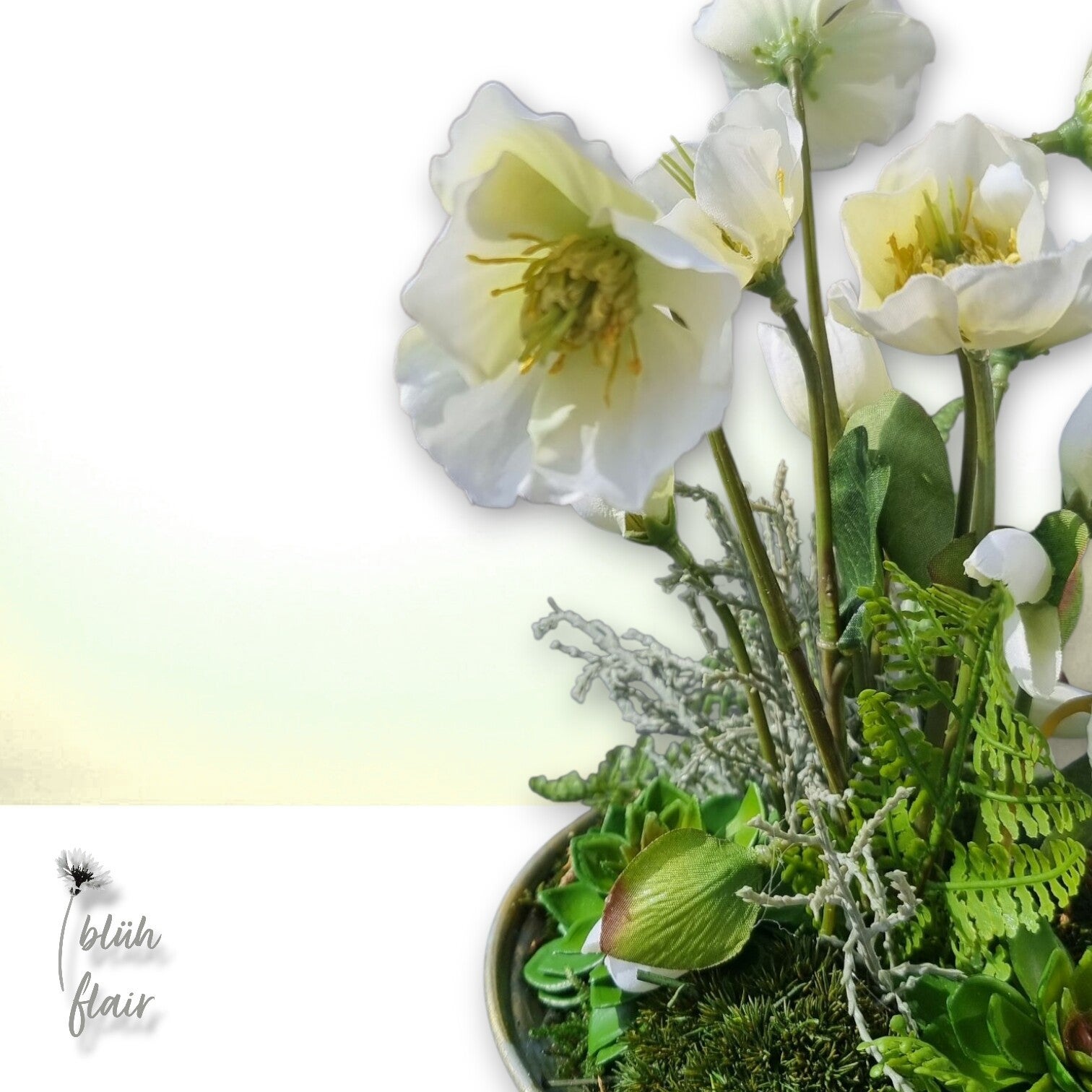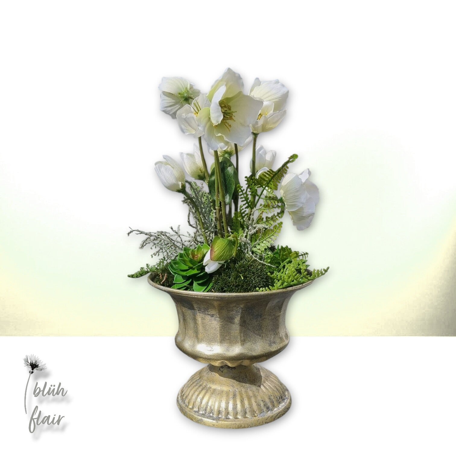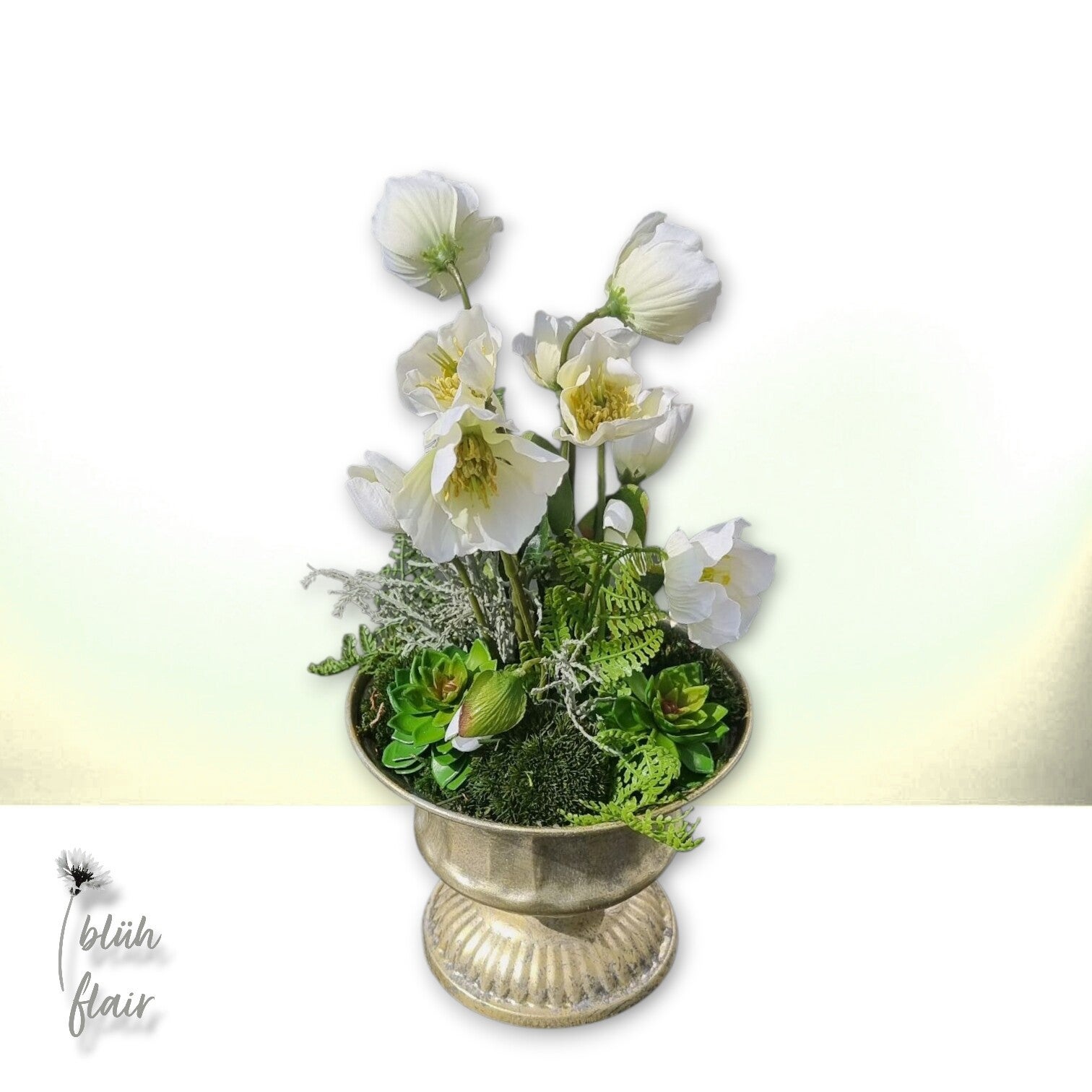 Das Christrosengesteck besteht aus weißen Christrosen, kombiniert mit Sukkulenten und Farn. Das Arrangement wird von verschiedenen Moosarten (Bollenmoos) umrahmt und ist in einem alt-Silberfarbenen Metallgefäß stilvoll arrangiert.