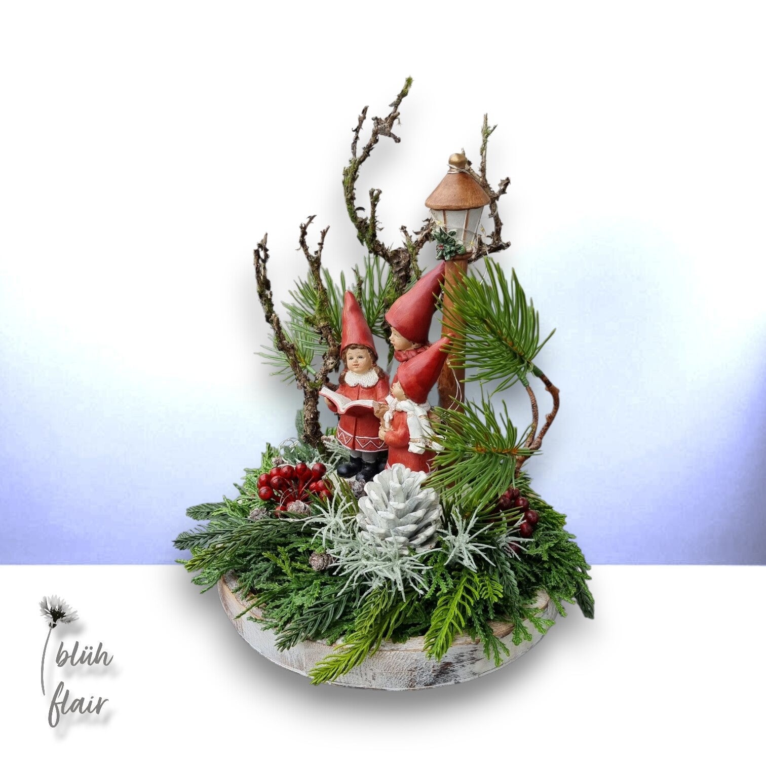 Das Gesteck "Weihnachtssingen unter einer Laterne" ist liebevoll gestaltet mit singenden Kindern, die unter einer Laterne stehen. Es ist dekoriert mit Tannenzweigen, Tannenzapfen, roten Beeren und Zweigen. Eine Lichterkette mit Akkupack für 2xAA-Batterien, das unter dem Kranz verstaut ist, sorgt für stimmungsvolle Beleuchtung und bietet eine Timerfunktion. Ein passendes Holztablett rundet das Arrangement ab und verleiht zusätzlichen Charme. Das Gesteck strahlt eine festliche Atmosphäre aus und beeindruckt mit viel Liebe zum Detail.