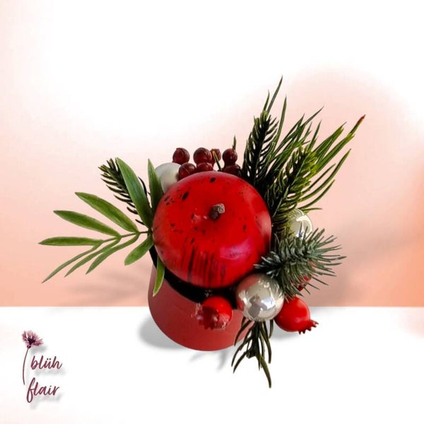 Dieses Gesteck ist perfekt für die Adventszeit, Weihnachten und darüber hinaus. Es macht sich hervorragend als Dekoration auf einem Esstisch oder als stilvoller Blickfang im Büro.