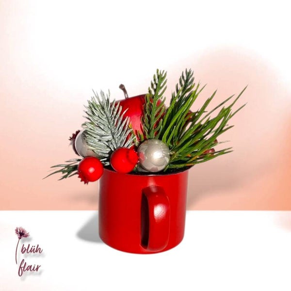 Der Apfeltee ist ein kleines Gesteck was mit einem kleinen Apfel in einer Tasse versehen ist. Dekoriert mit Kunsttanne, Beeren und kleinen silberfarbenen Weihnachtskugeln strahlt es ein hübsches Weihnachtsambiente aus. Das Gesteck ist in einer roten Metalltasse arrangiert.