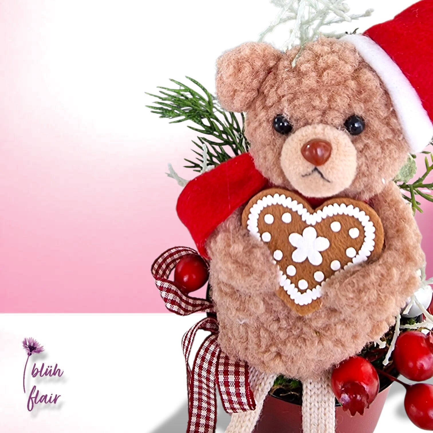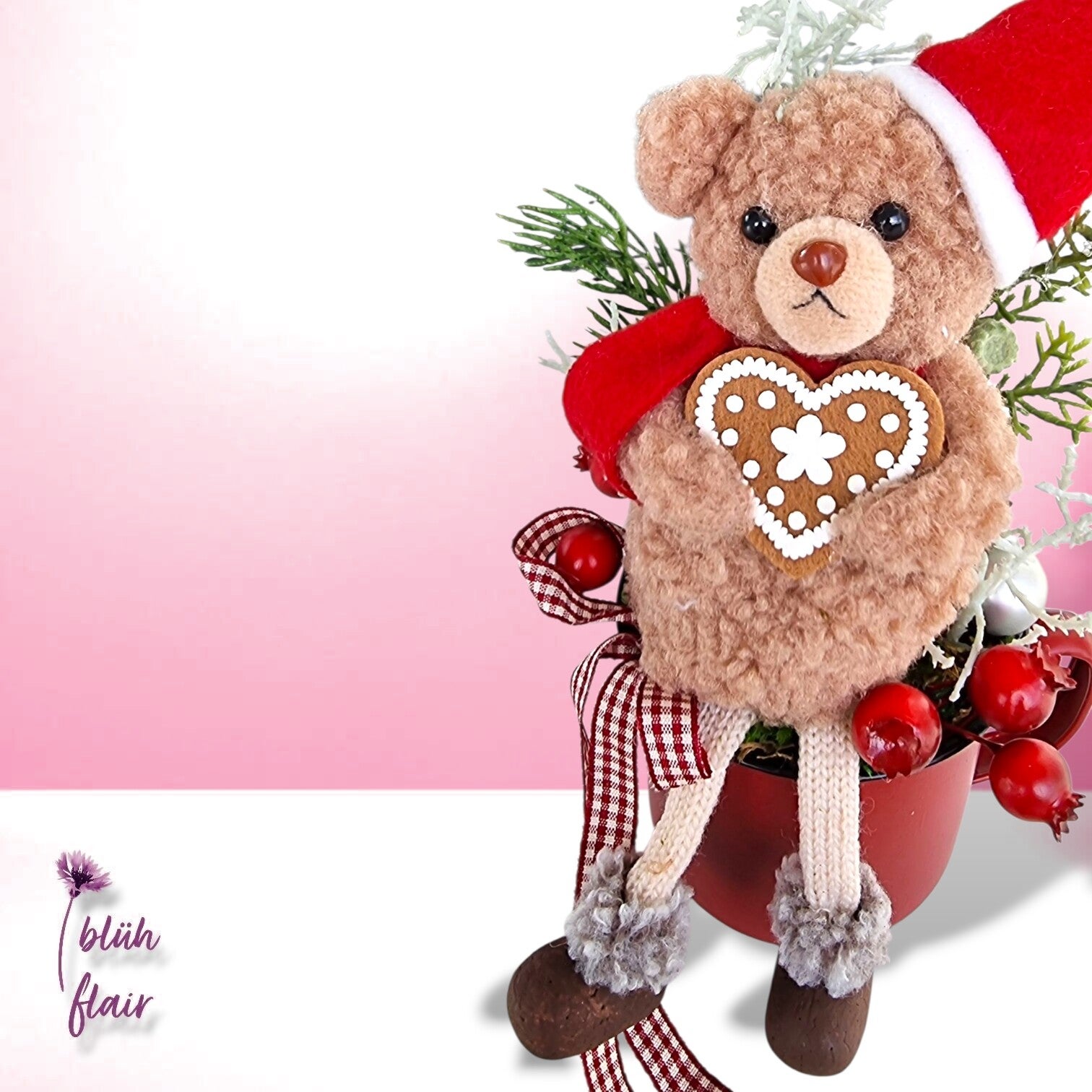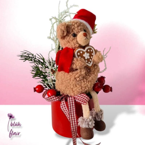 Das Gesteck Teddys Weihnachtsbecher Nr.2 ist mit einem süßen Teddy, der eine rote Weihnachtsmütze trägt. Der Teddy ist auf einer roten Tasse arrangiert. Dekoriert ist er mit Kunsttanne, Beeren und kleinen Tannenzapfen, silberfarbenen Weihnachtskugeln strahlt es ein hübsches Weihnachtsambiente aus.