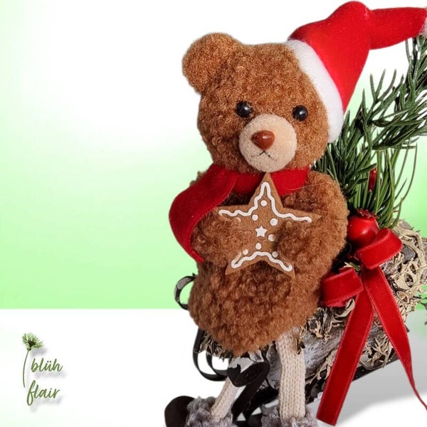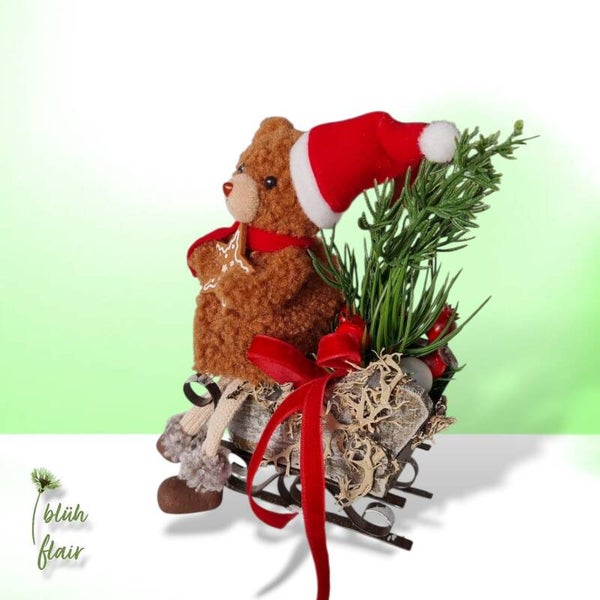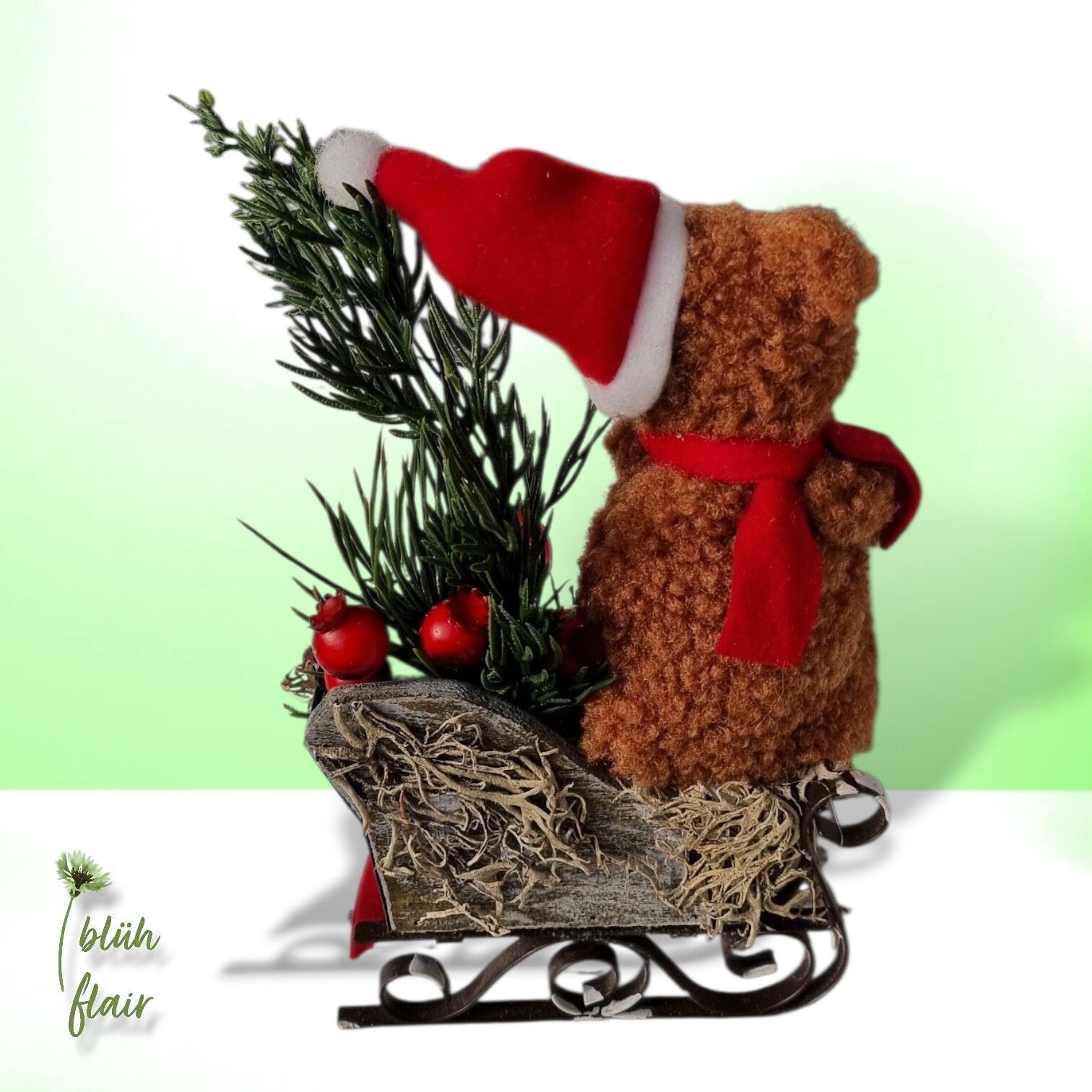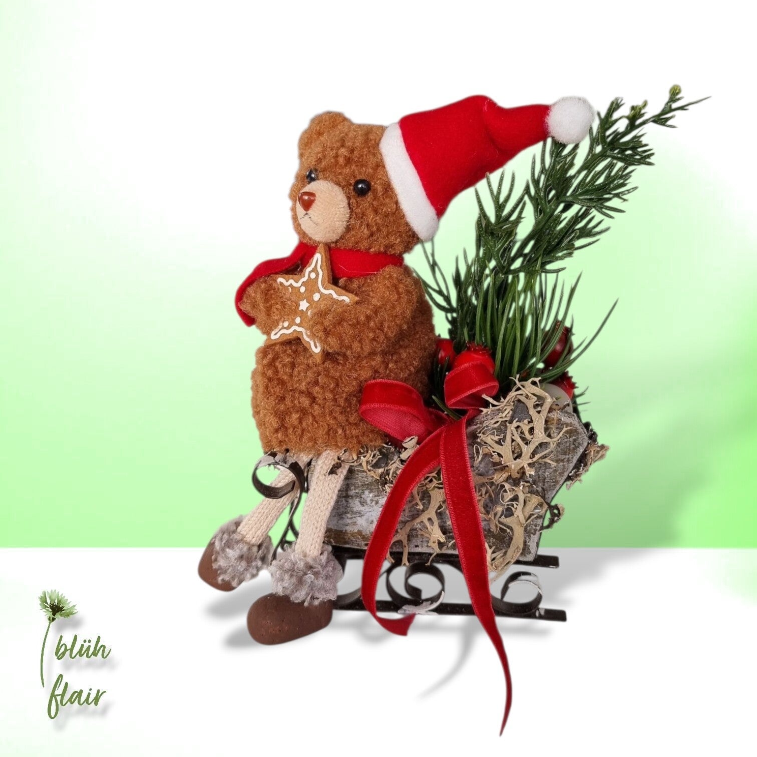 Weihnachtsarrangement: Teddy auf Schlitten - Teddys Schlittenfahrt Nr.1 - L14xB10xH19