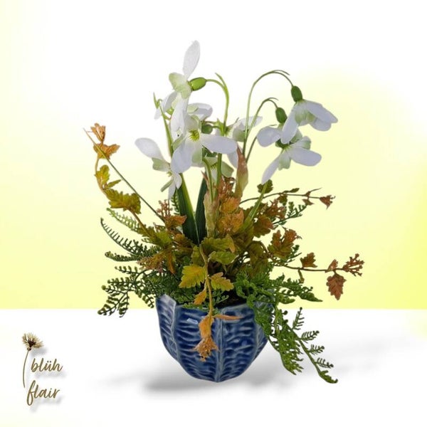 Das Schneeglöckchengesteck besteht aus weißen Schneeglöckchen, kombiniert mit Farn. Arrangiert ist es in einem blaufarbenen Keramikgefäß.