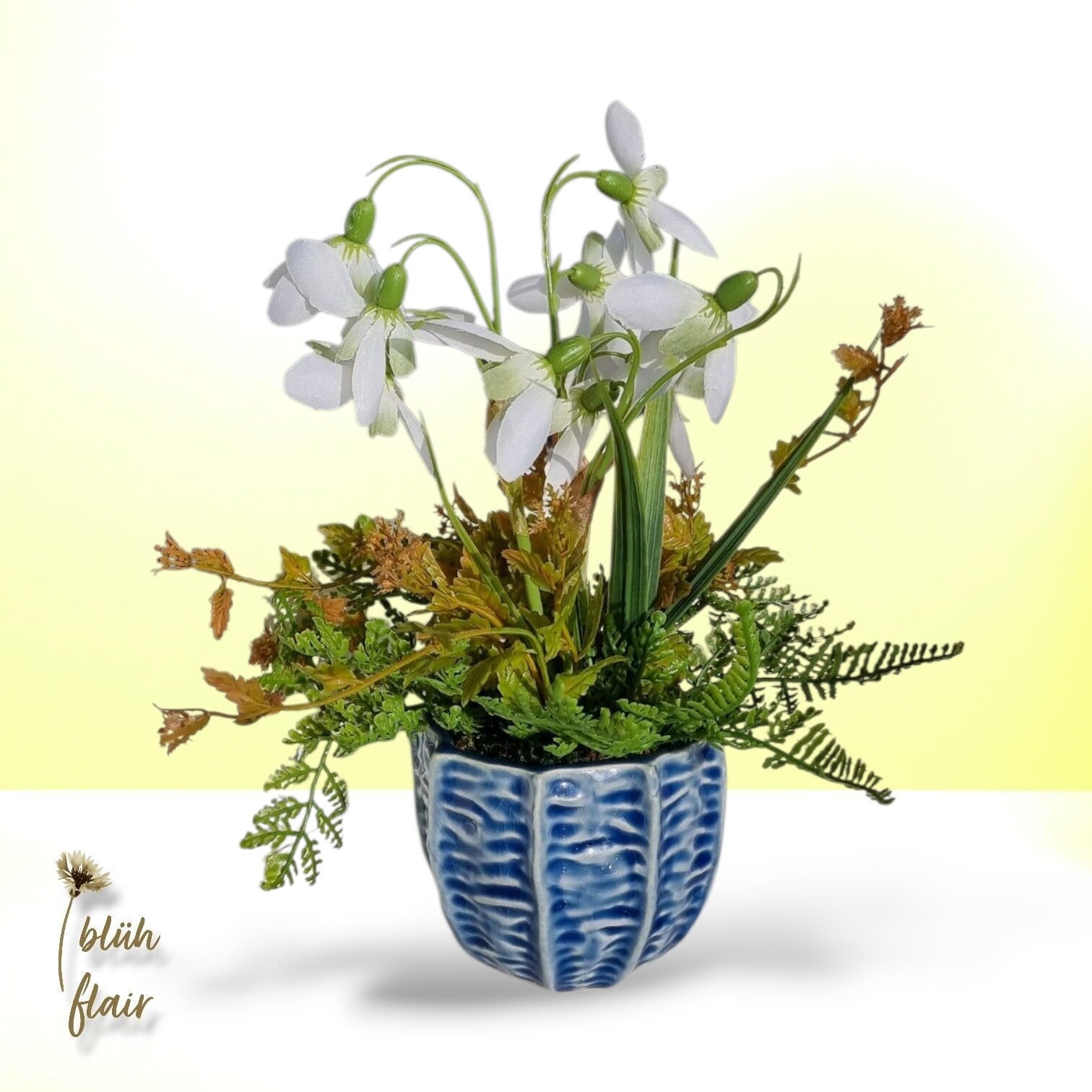 Seidenblumen Arrangement: Schneeglöckchen in Keramik Gefäß - Schneeglöckchenzeit - ⌀18xH23