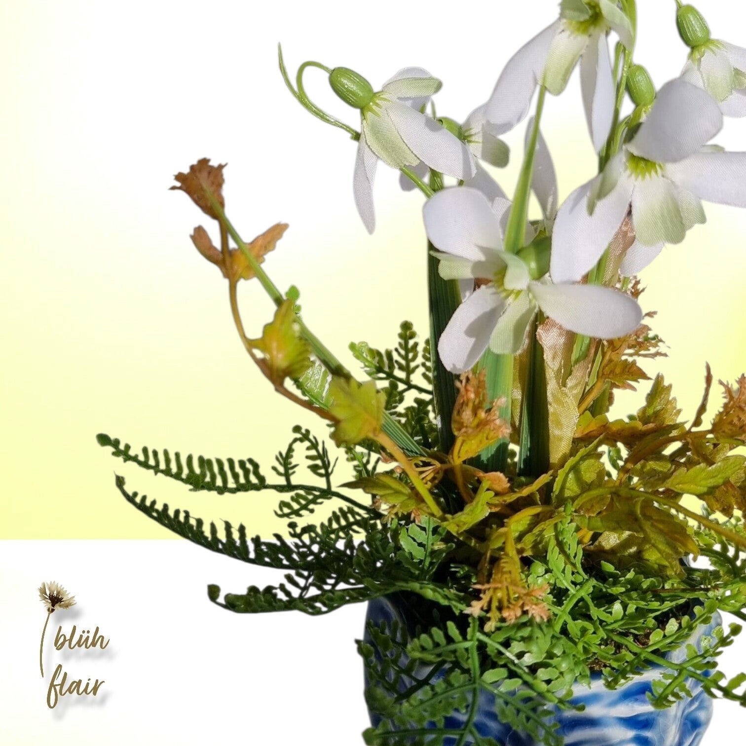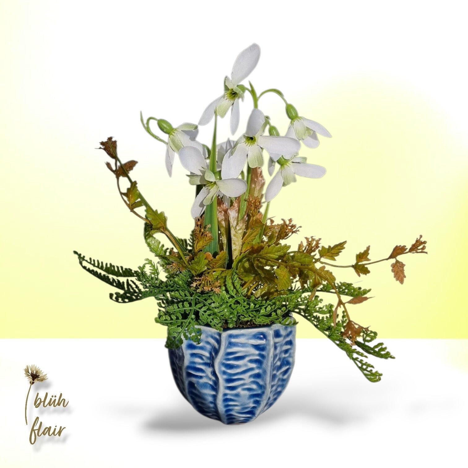 Seidenblumen Gesteck - Frühling: Schneeglöckchen in Keramikgefäß - "Schneeglöckchenzeit" - Weiß/Blau ⌀18xH23cm