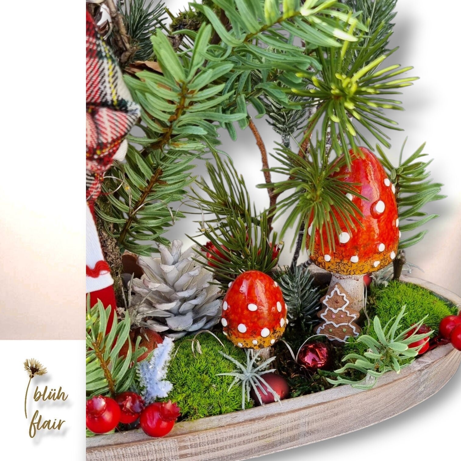 Das Gesteck "Weihnachtsbäckerei" bringt die zauberhafte Weihnachtswelt direkt in Ihr Zuhause. Im Mittelpunkt steht ein liebevoll gestalteter Weihnachtsmann, der für die Kinder Plätzchen backt und so die Magie der Weihnachtszeit zum Leben erweckt. Umgeben von Tannenzweigen, dekorativen Zapfen, roten Beeren und filigranen Ästen vermittelt das Arrangement ein authentisches Waldfeeling, das die Sinne verzaubert. Eine dezente, geschmackvoll integrierte Lichterkette mit praktischem Akkupack sorgt für eine stimmungsvolle Beleuchtung und unterstreicht die festliche Atmosphäre. Dieses Gesteck ist die ideale Ergänzung für Ihre Weihnachtsdekoration und ein echter Blickfang, der Jung und Alt begeistert.