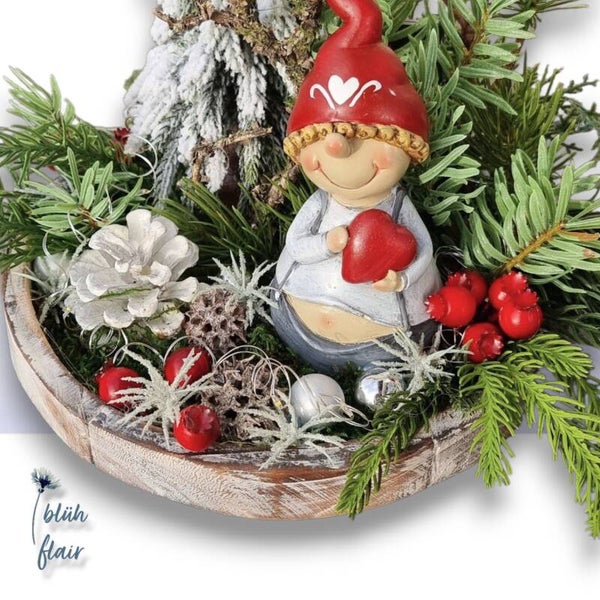 Weihnachtsarrangement: Wichtel auf Tablett - Wichtelmann mit Herz - ⌀30xH24