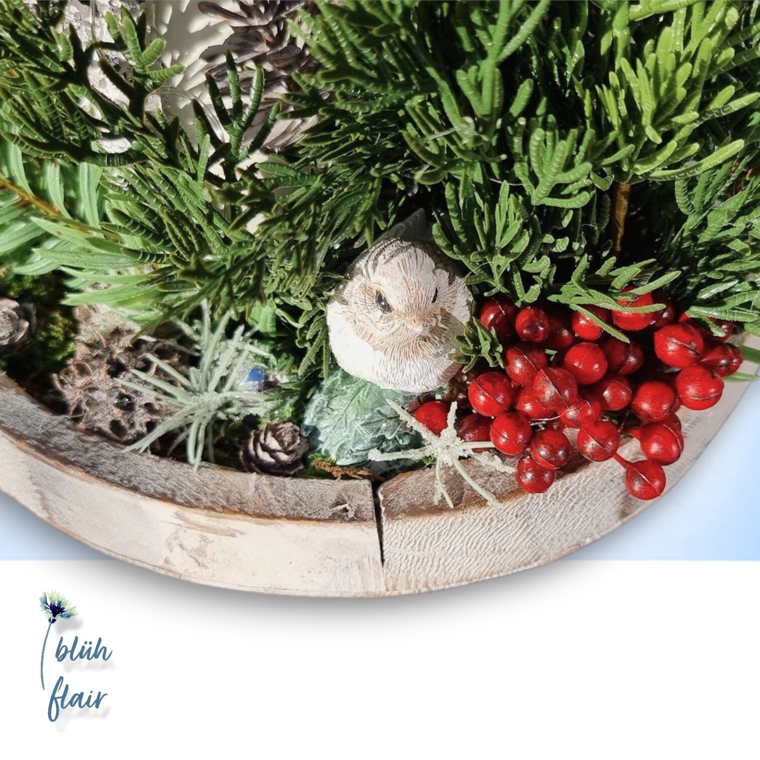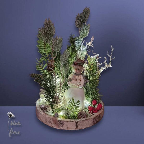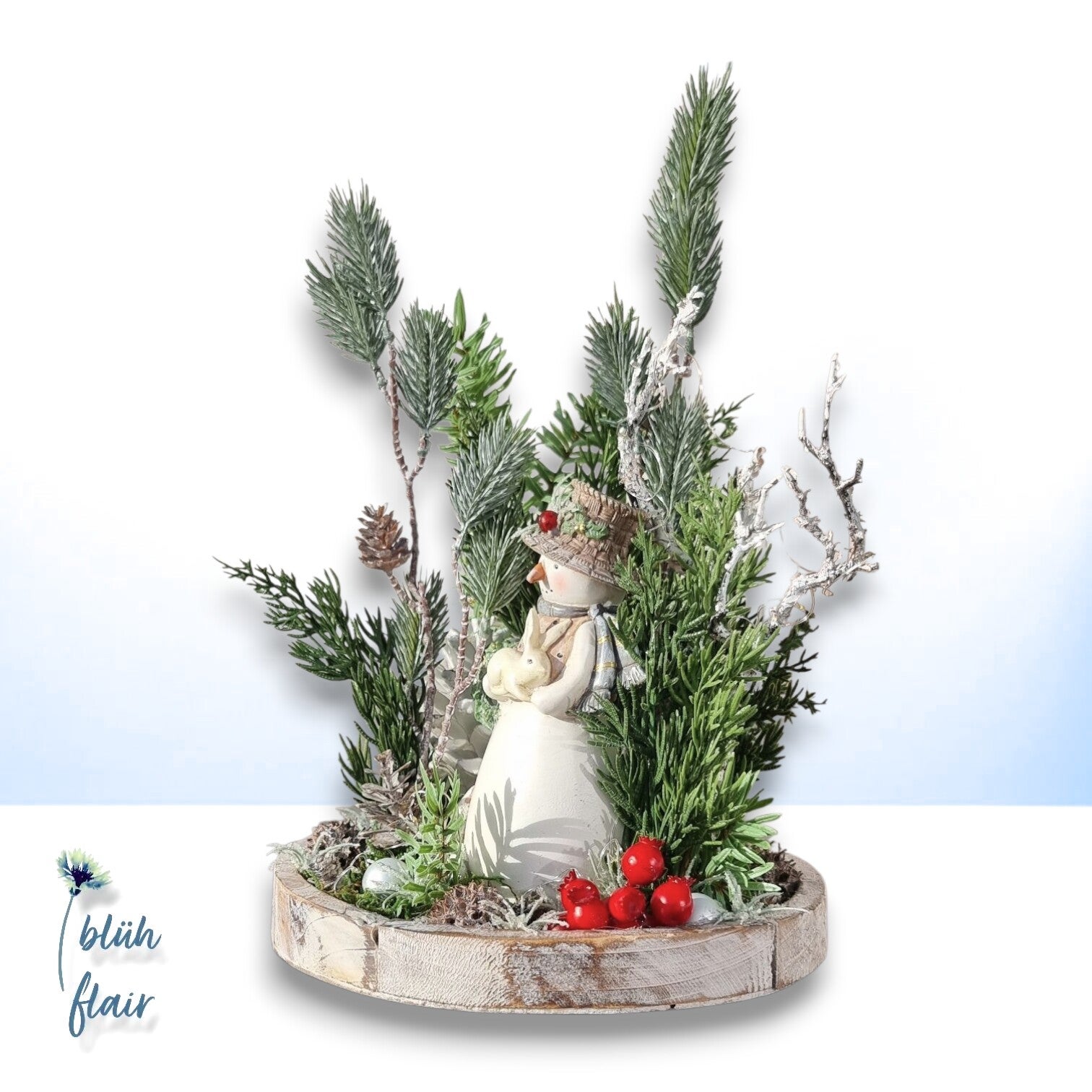 Weihnachtsgesteck: Schneemann auf Tablett - "Schneemannfrau im Märchenwald" - ⌀24xH34cm