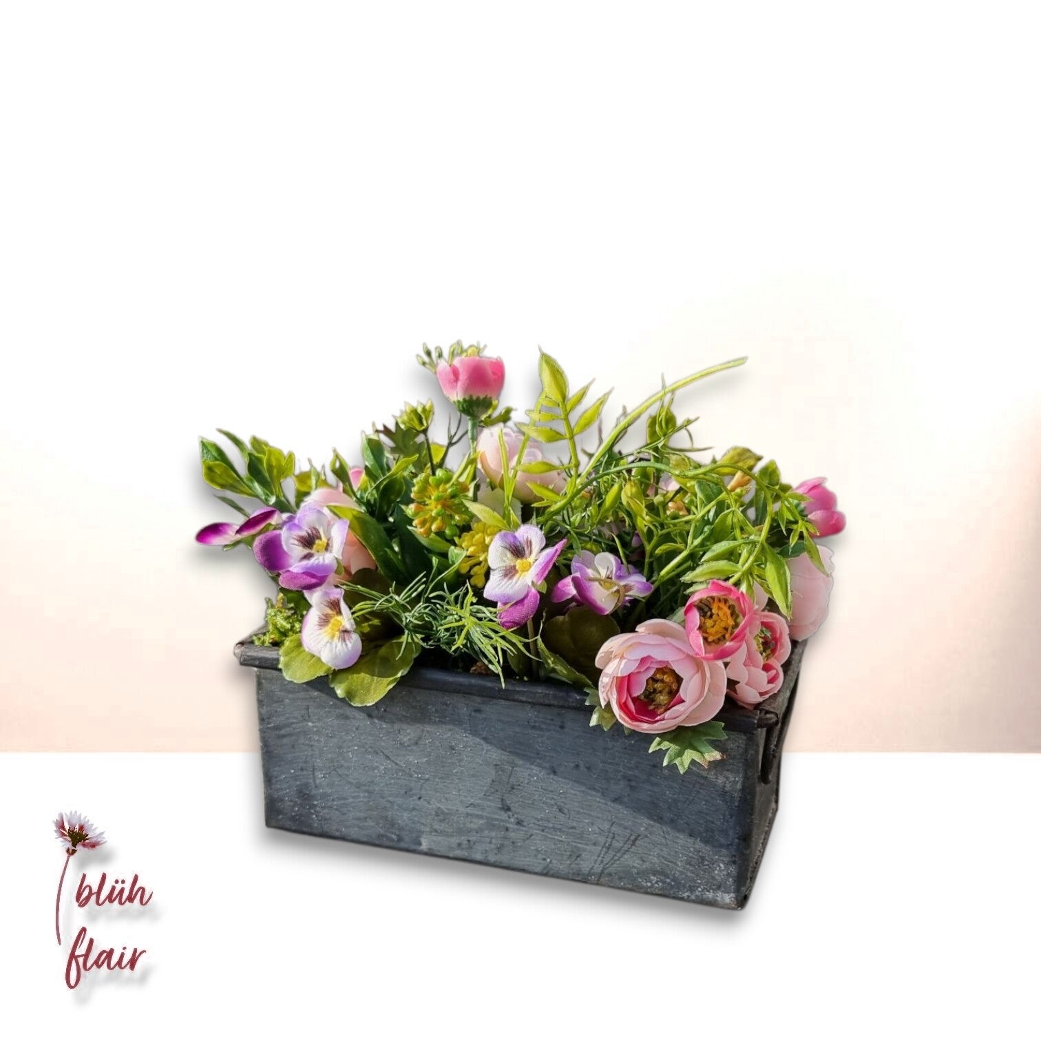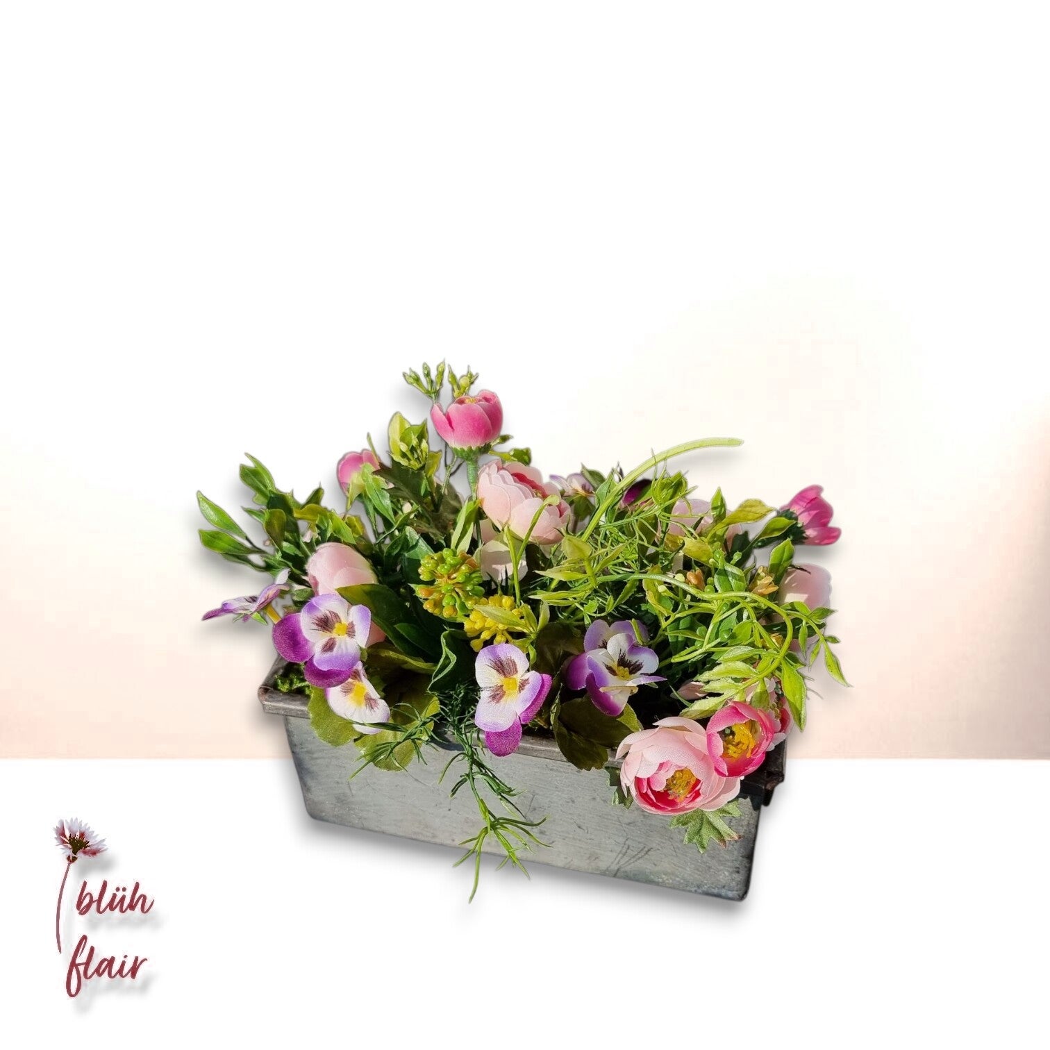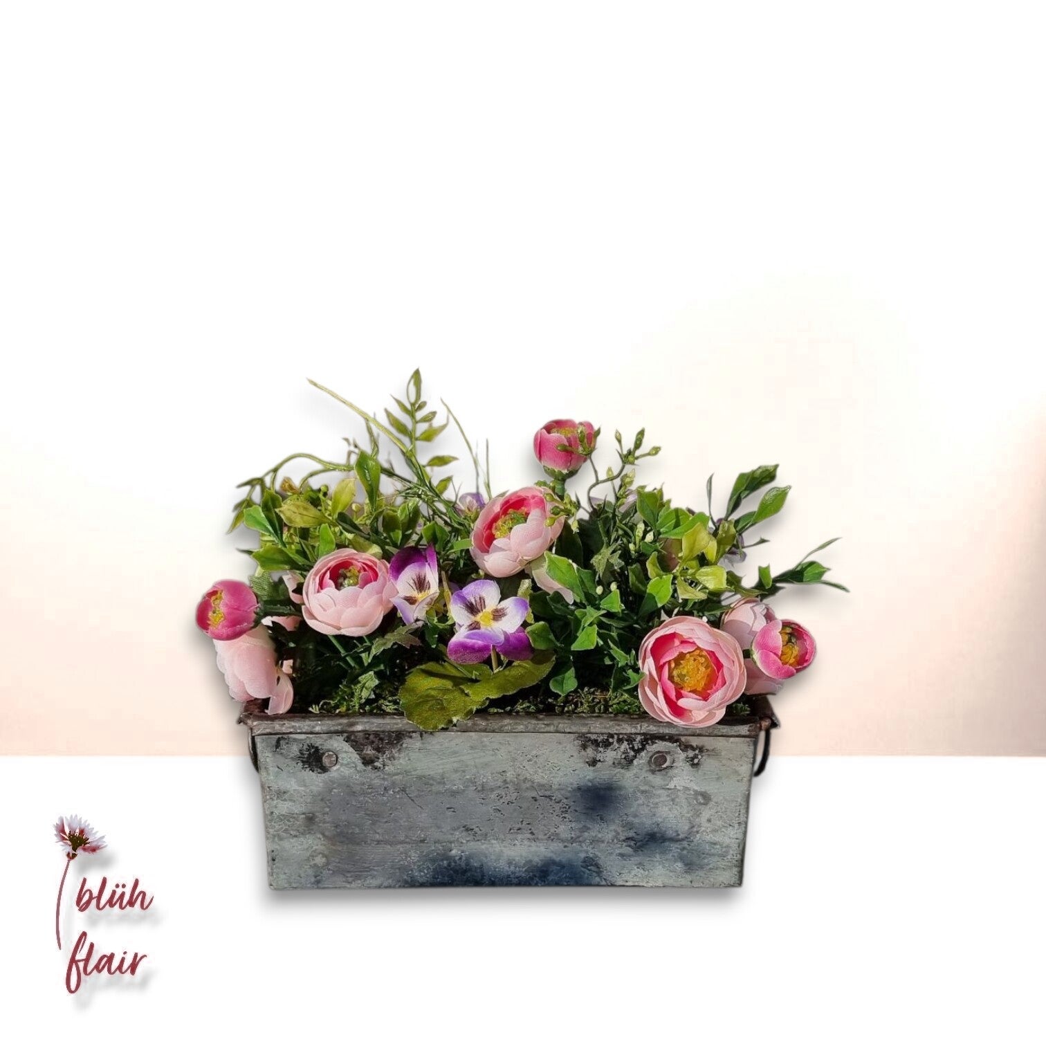 Seidenblumen Gesteck - Frühling: Ranunkeln im Kasten - "Ranunkel Kasten (klein)" - L20xB17xH18cm