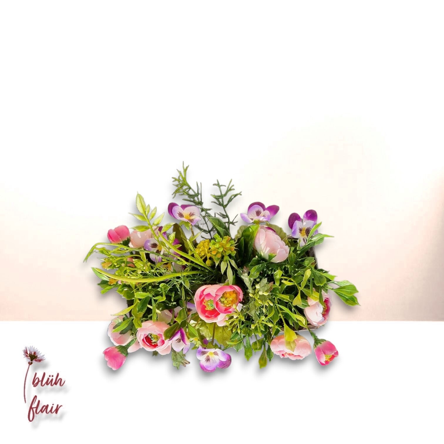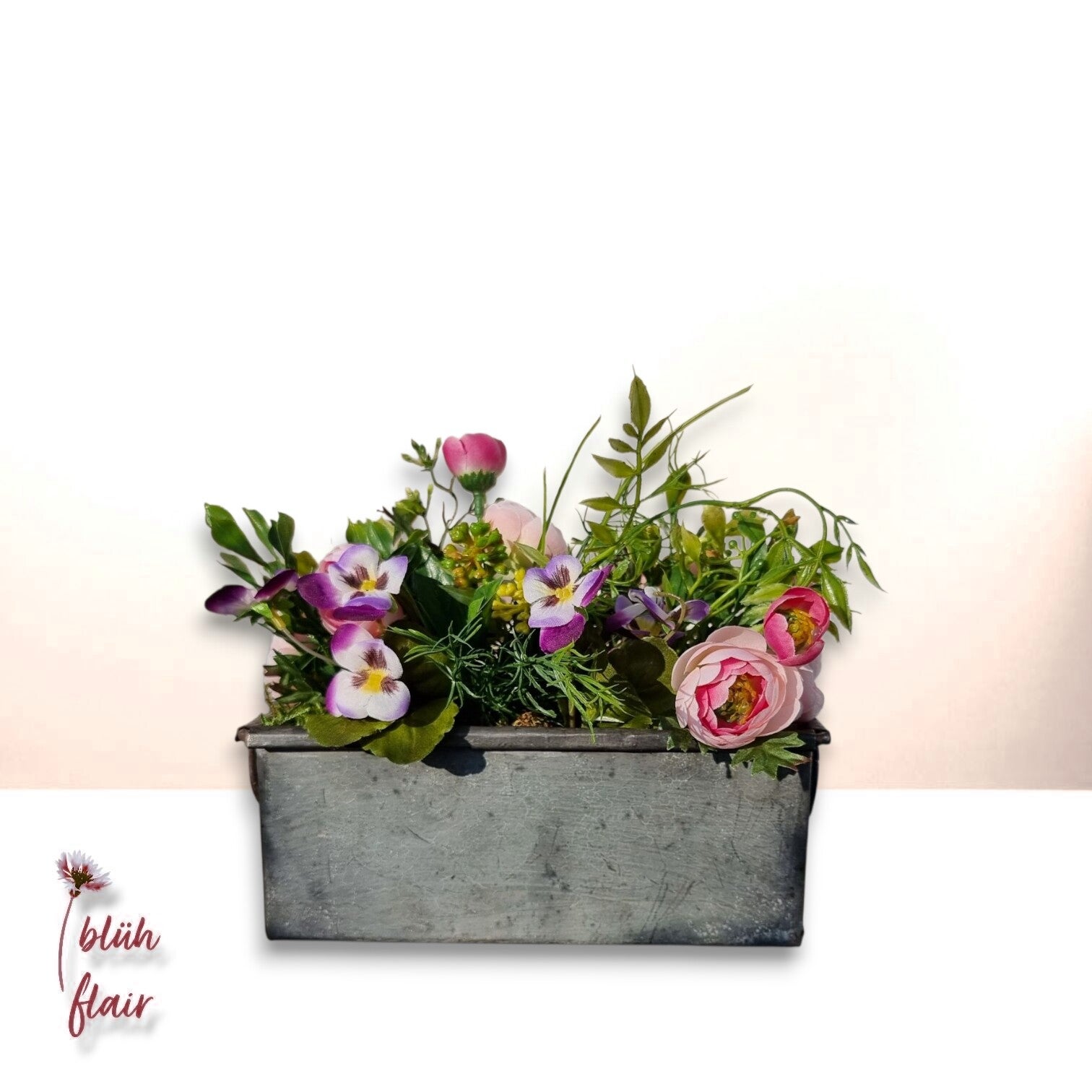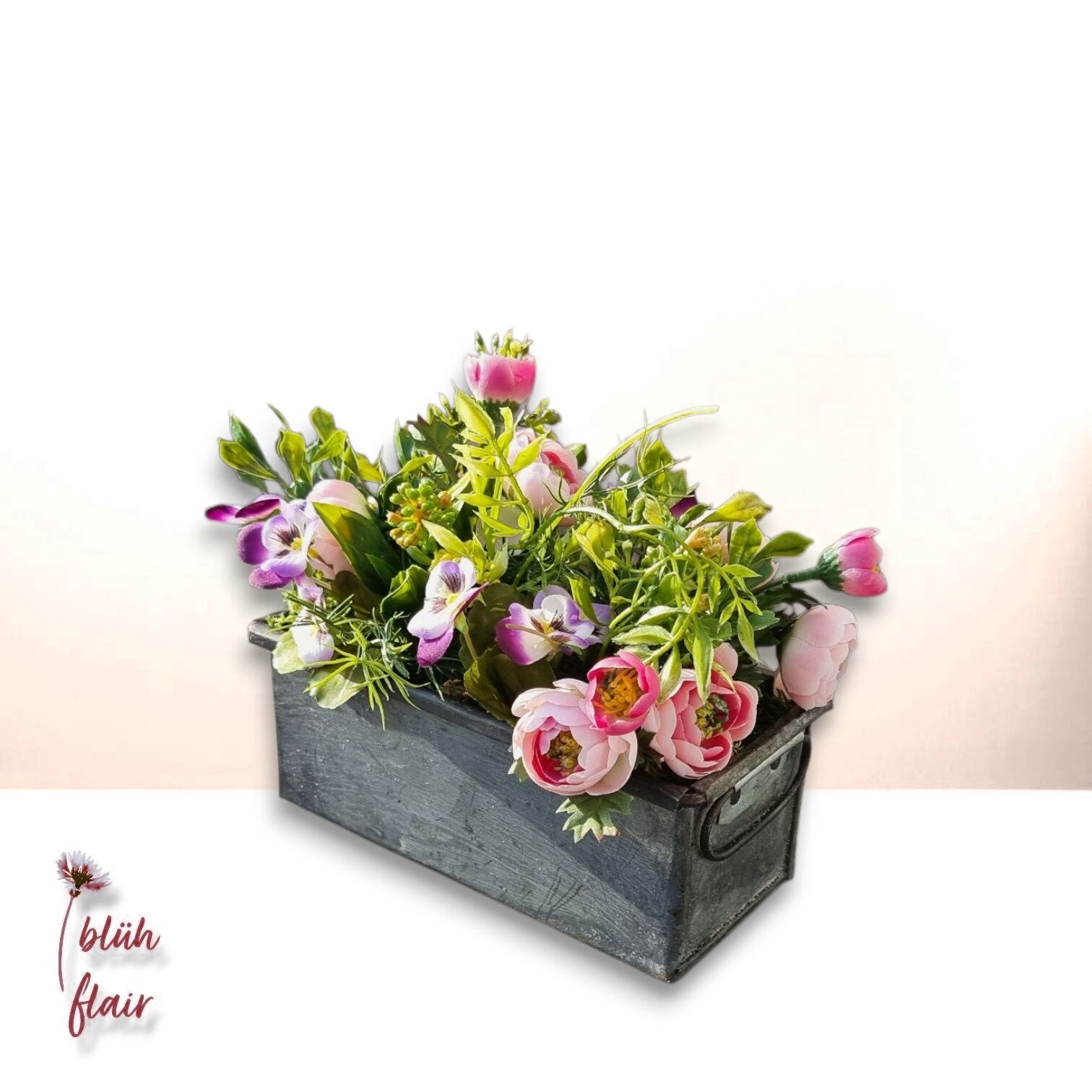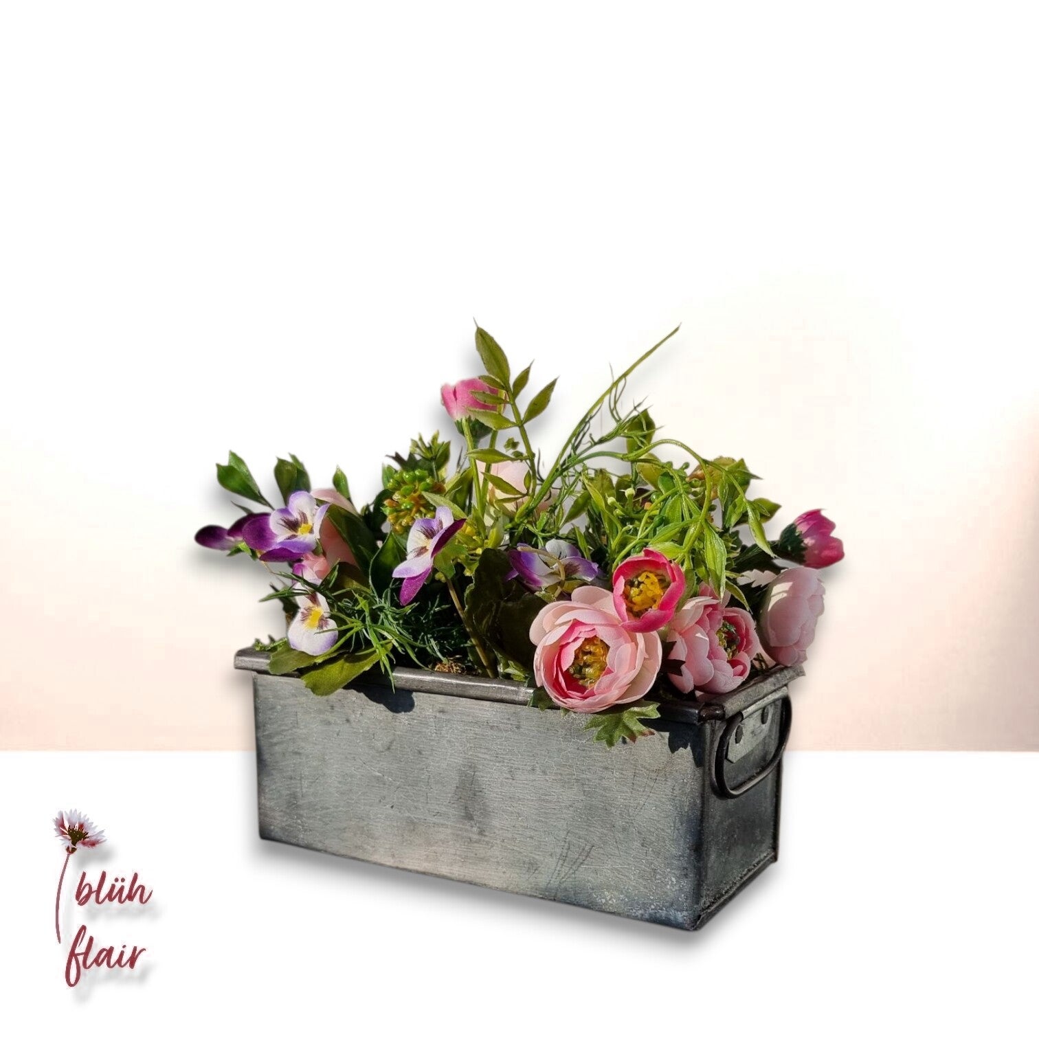 Seidenblumen Gesteck - Frühling: Ranunkeln im Kasten - "Ranunkel Kasten (klein)" - L20xB17xH18cm