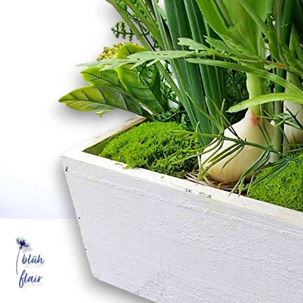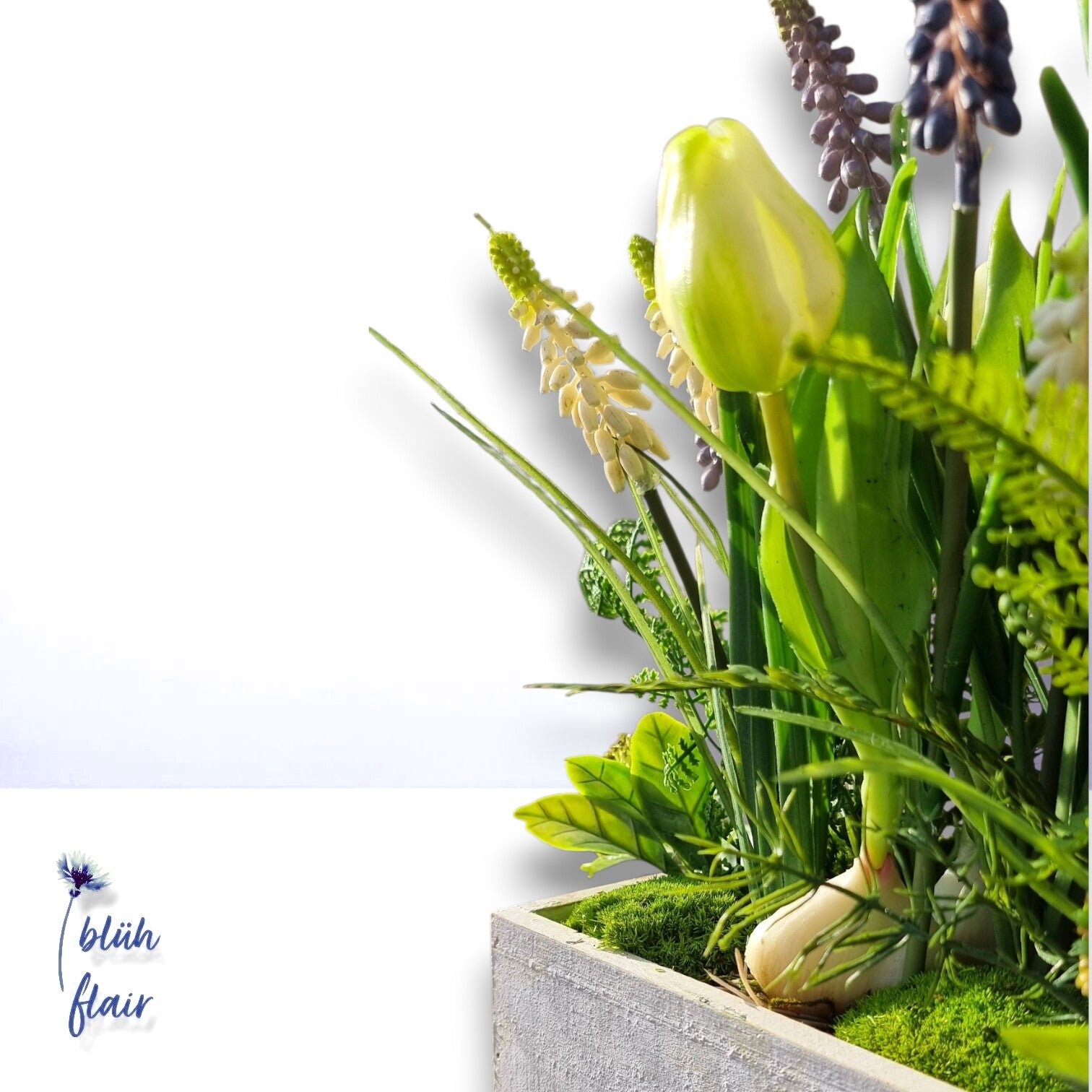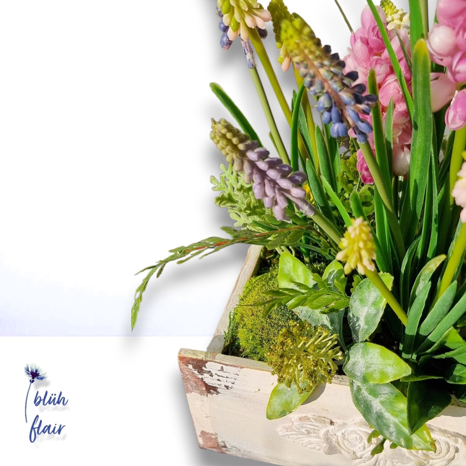 Holen Sie sich den Frühling nach Hause: Dieses liebevoll von Hand gefertigte Seidenblumengesteck von Blühflair ist ein einzigartiges Unikat. In einer rustikalen Holzschublade arrangiert, betont es den charmanten Landhausstil und eignet sich ideal als langlebige Tischdekoration oder als besonderes Geschenk. Verschiedene Hyazinthen und kleine weiße Tulpen, ergänzt durch besonderes Bollenmoos, bringen eine herrliche Frische in Ihr Zuhause. Die harmonische Farbpalette aus Rosa, Blau, Weiß und Grün wird Ihnen als Seidenblumengesteck aus eigener Herstellung viele Jahre erneut Freude bereiten.