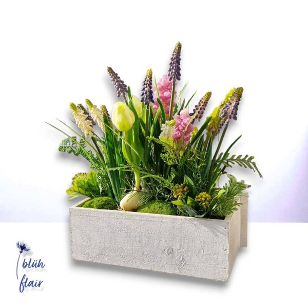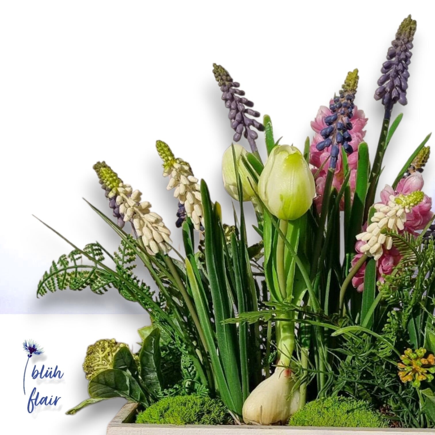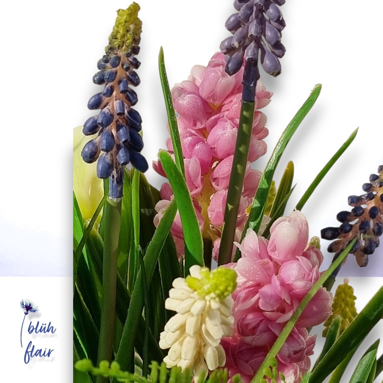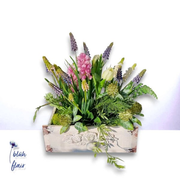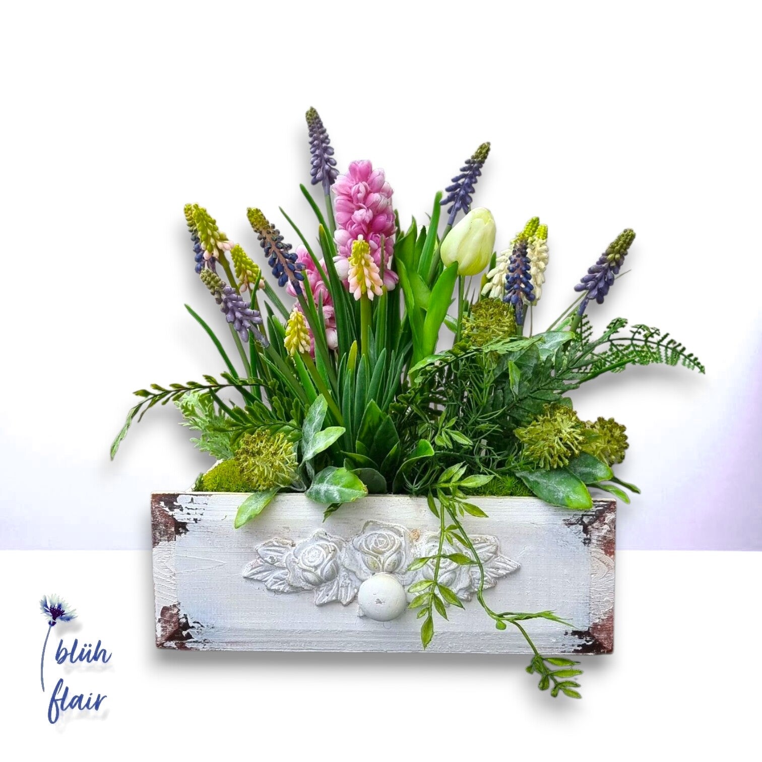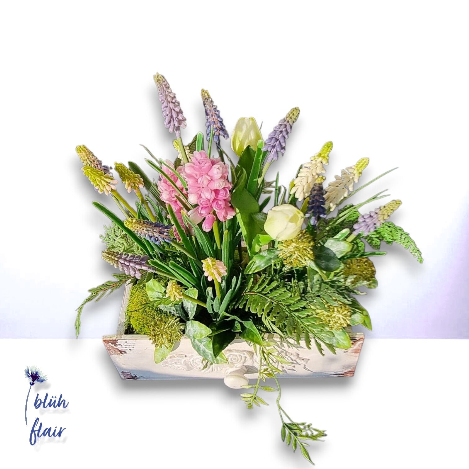 Seidenblumen Gesteck - Frühling: Hyazinthen in Schublade - "Frühlingszauber mit Hyazinthen" - L27xB19xH33cm