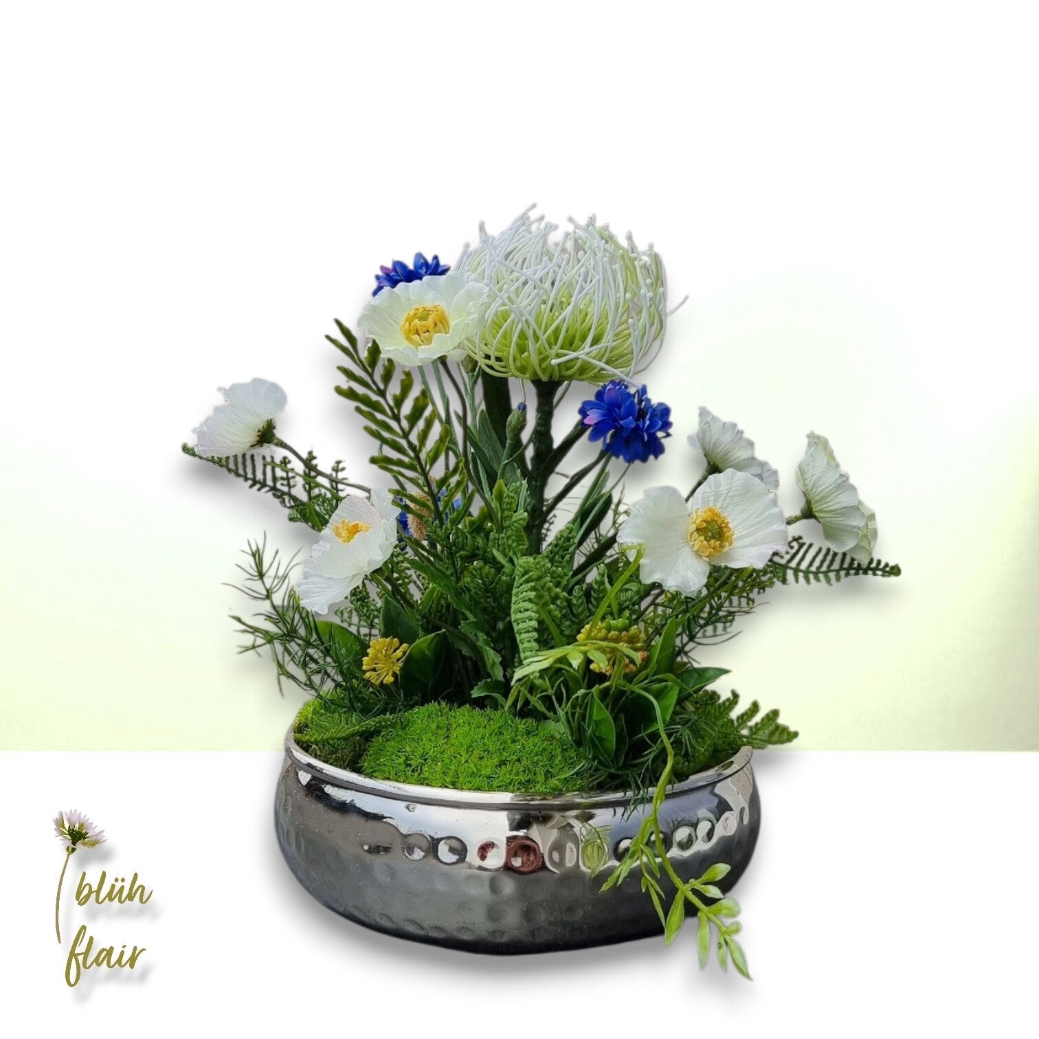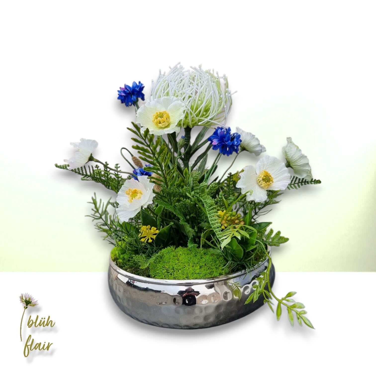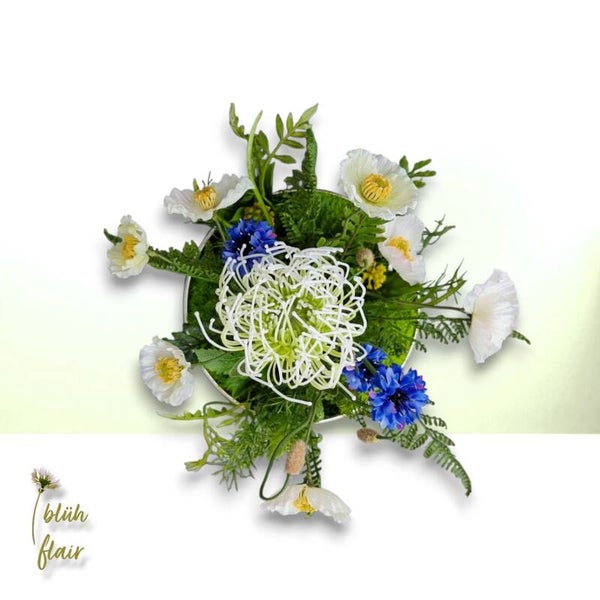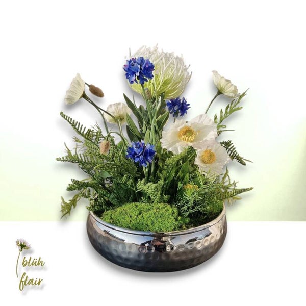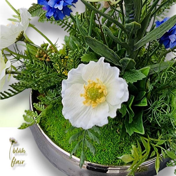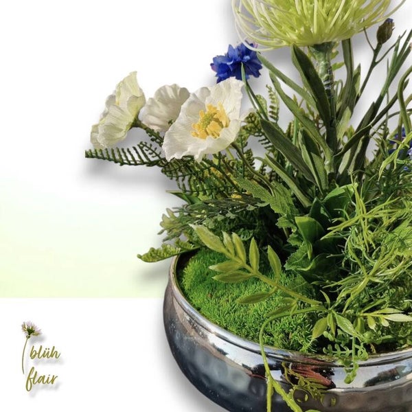 Erleben Sie den exklusiven "Weißen Mohntraum" – ein luxuriöses Seidenblumen-Arrangement, das zeitlose Eleganz in Ihr Zuhause bringt. Zarte, naturgetreue weiße Mohnblüten ruhen stilvoll auf hochwertigem Ballenmoos, arrangiert in einer ansprechenden silbernen Dekoschale. Farbakzente durch künstliche Kornblumen, exotische Protea und feine Farnblätter verleihen der Komposition eine einzigartige, moderne Note. Dieses langlebige Arrangement ist die ideale, pflegeleichte Tischdekoration, ein stilvolles Geschenk oder ein permanentes Highlight für jede Einrichtung. Ein bezaubernder Blickfang, der die Ästhetik der Natur widerspiegelt.
