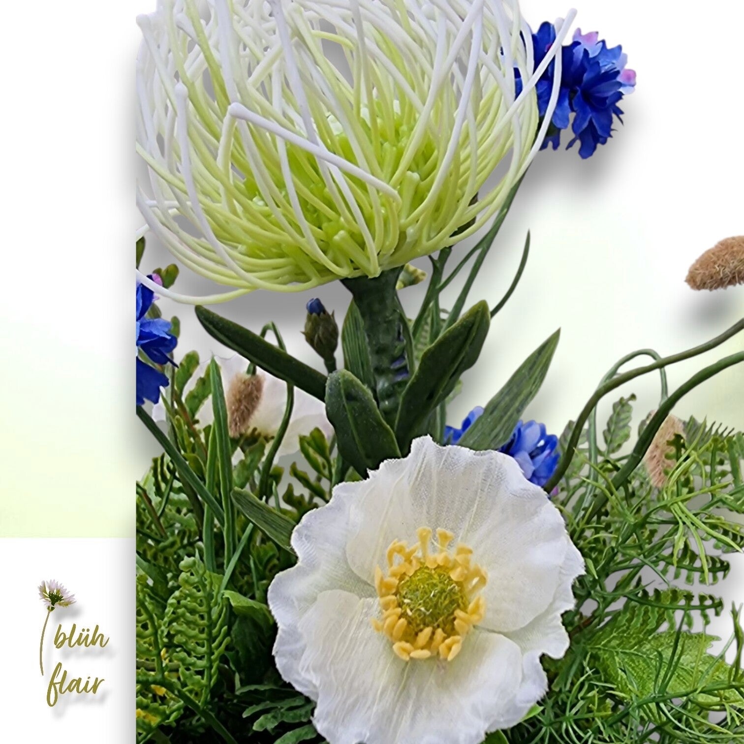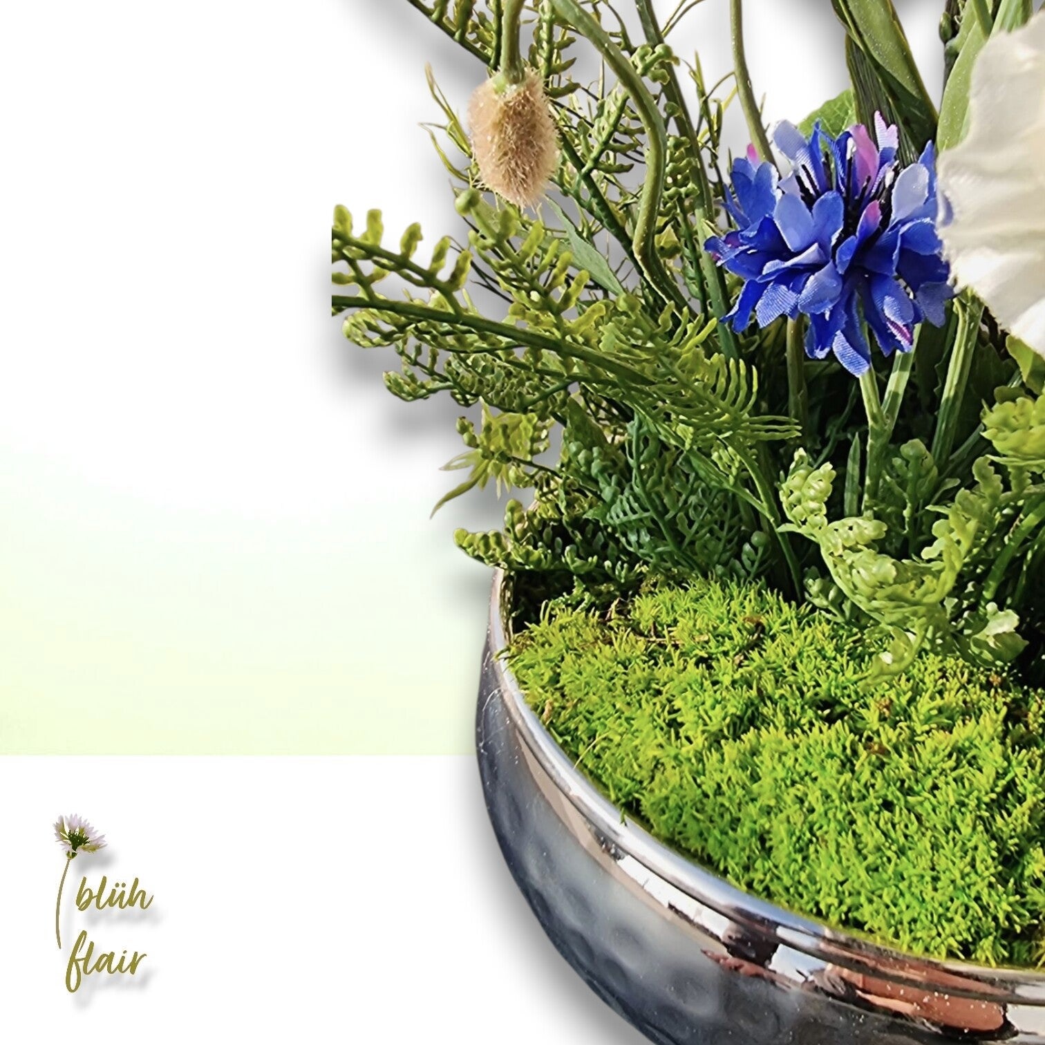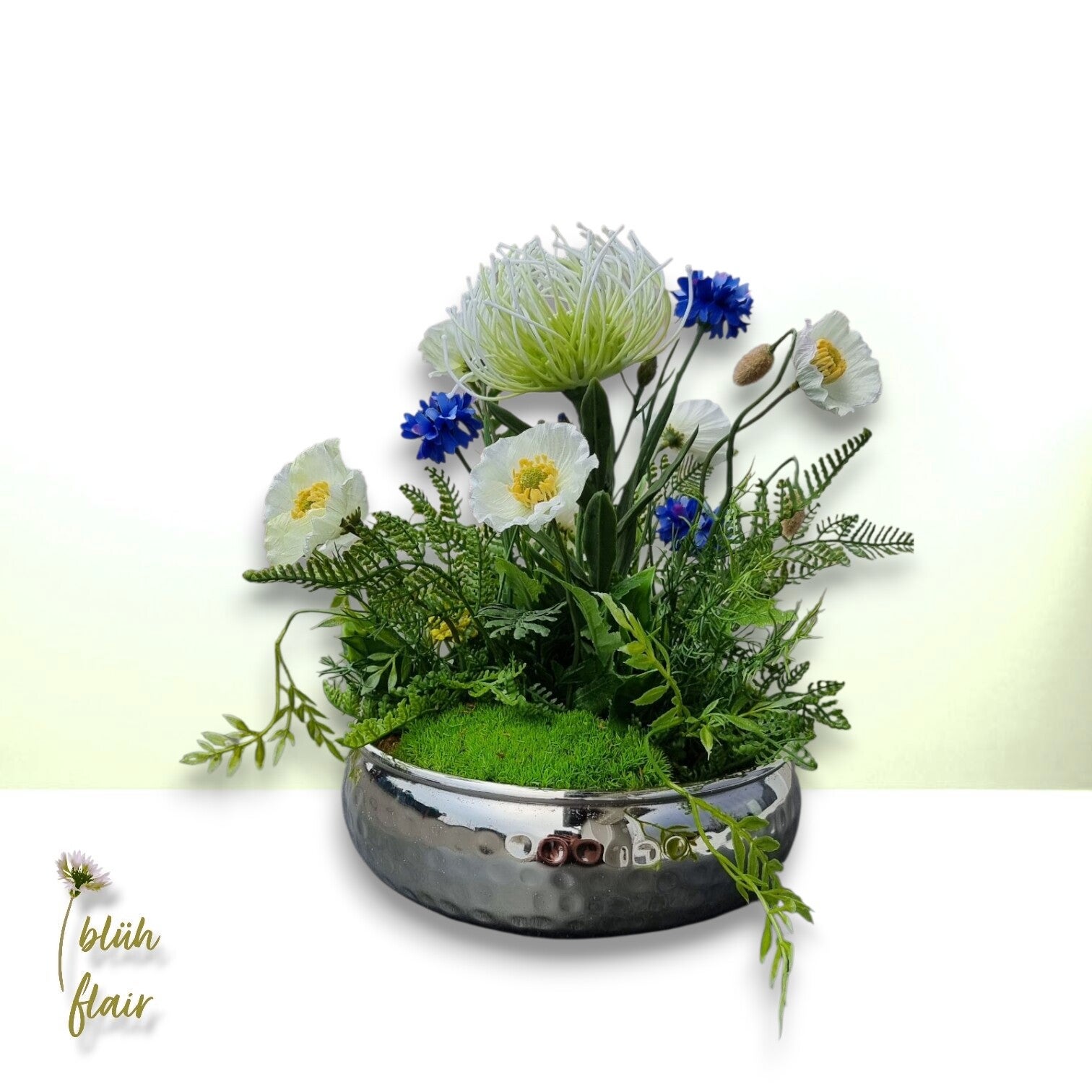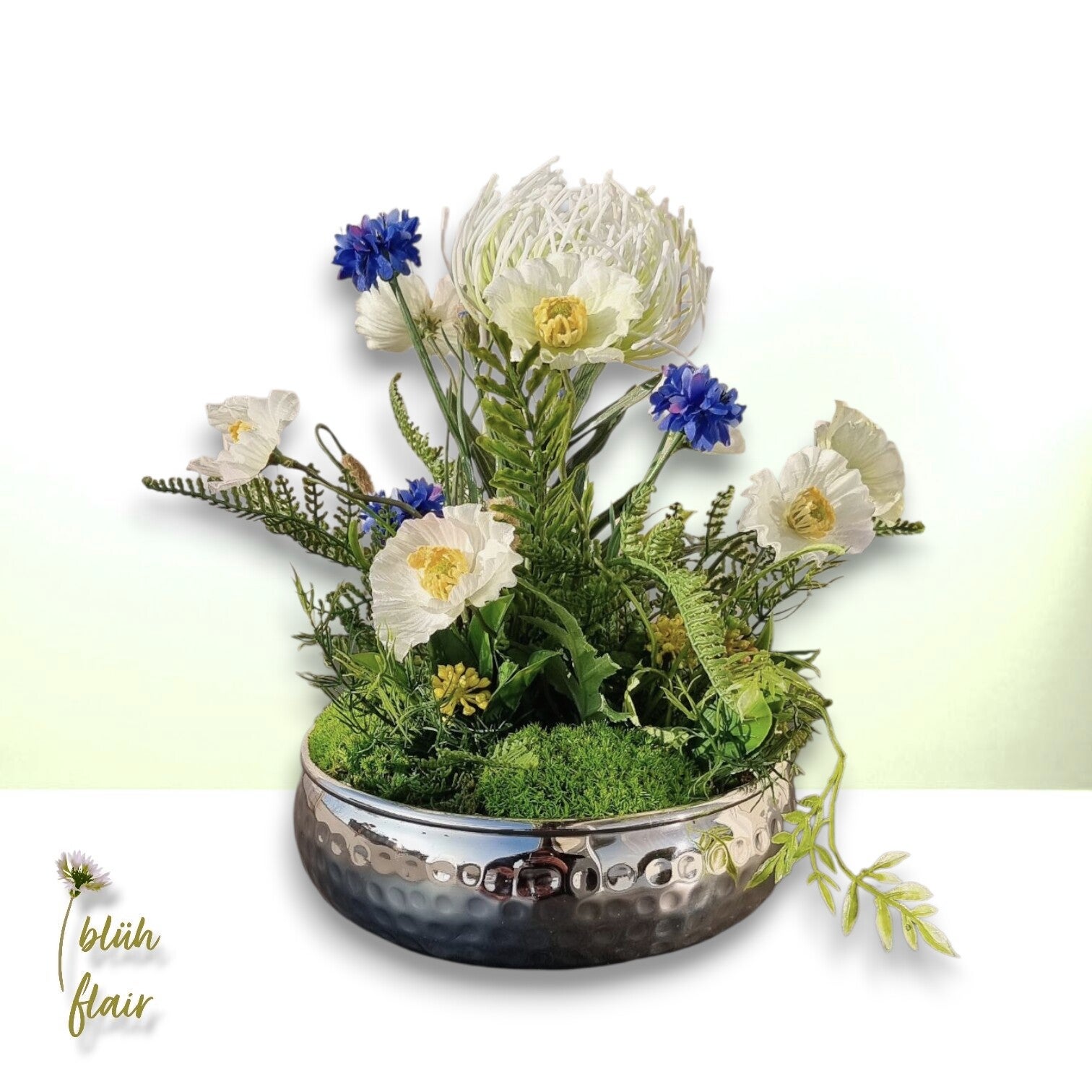 Erleben Sie den exklusiven "Weißen Mohntraum" – ein luxuriöses Seidenblumen-Arrangement, das zeitlose Eleganz in Ihr Zuhause bringt. Zarte, naturgetreue weiße Mohnblüten ruhen stilvoll auf hochwertigem Ballenmoos, arrangiert in einer ansprechenden silbernen Dekoschale. Farbakzente durch künstliche Kornblumen, exotische Protea und feine Farnblätter verleihen der Komposition eine einzigartige, moderne Note. Dieses langlebige Arrangement ist die ideale, pflegeleichte Tischdekoration, ein stilvolles Geschenk oder ein permanentes Highlight für jede Einrichtung. Ein bezaubernder Blickfang, der die Ästhetik der Natur widerspiegelt.