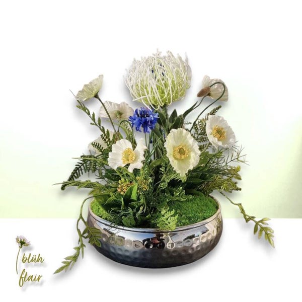 Seidenblumen Gesteck - Sommer: Mohnblumen in Silberschale - "Weißer Mohntraum" - ⌀25xH29cm