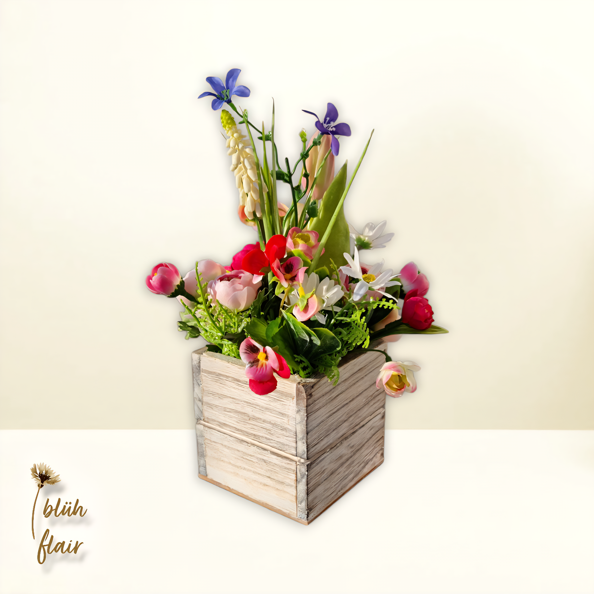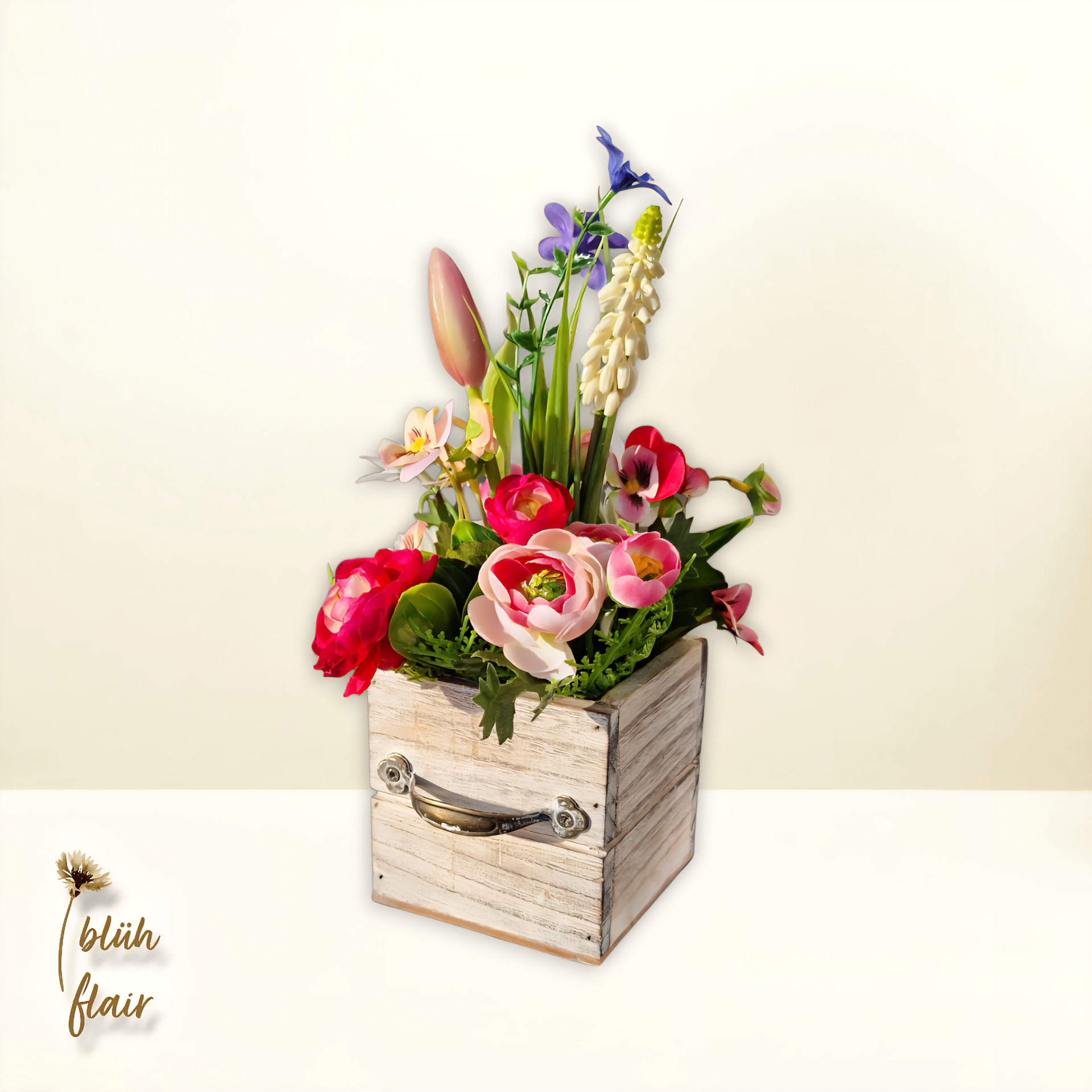 Frühlingsgesteck Seidenblumen: Frühlingsblumen in Schublade - "Kleine Frühlingsschublade Nr.2" - L15xB15xH25