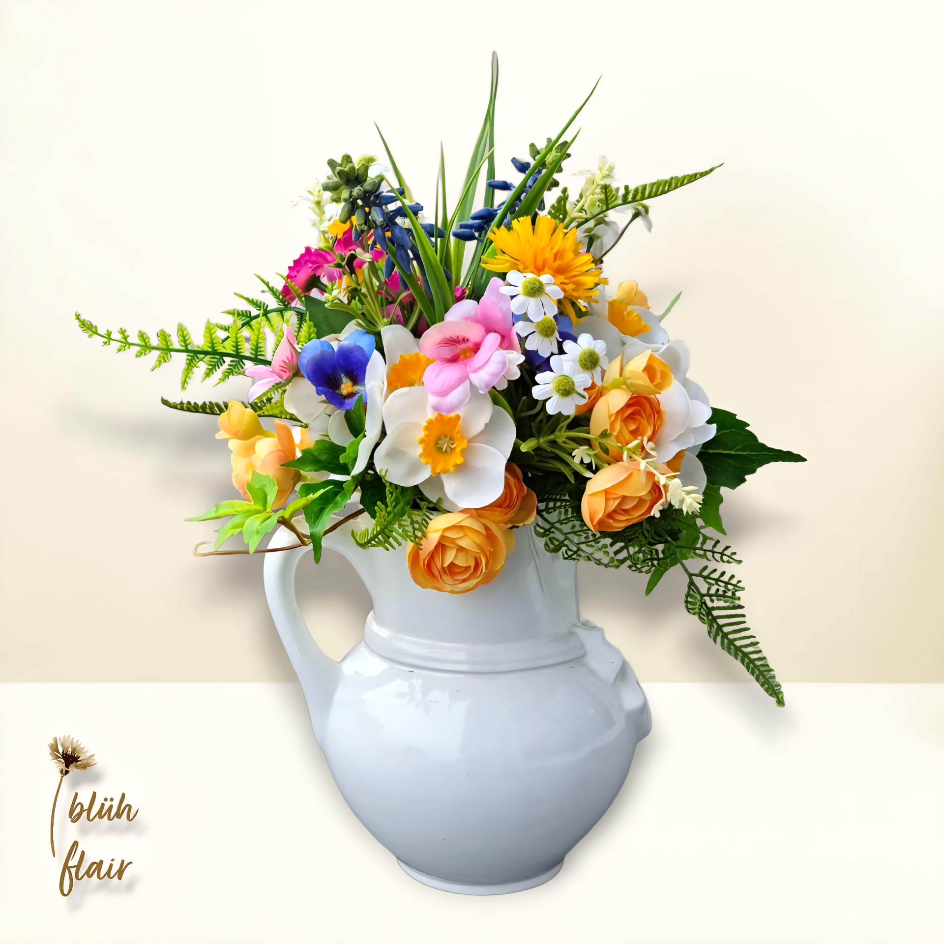 Das Frühlingsbouquet Farbenpracht Nr.2 bringt mit seiner Komposition aus leuchtenden Narzissen, Löwenzahn und zarten Ranunkeln die erste Frühlingssonne direkt in Ihr Zuhause. Die handverlesenen Seidenblumen wirken durch die feinen Farnblätter besonders lebendig und behalten dauerhaft ihre intensive Strahlkraft, ganz ohne Welken. Mit seinen kompakten Maßen von 26 Zentimetern Durchmesser und 30 Zentimetern Höhe setzt dieses handgefertigte Unikat moderne Akzente auf jedem Tisch und verleiht Ihrem Ambiente eine exklusive, natürliche Note.