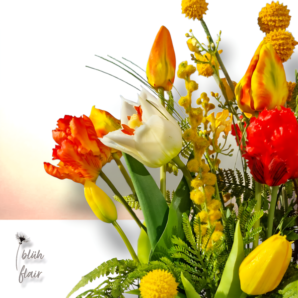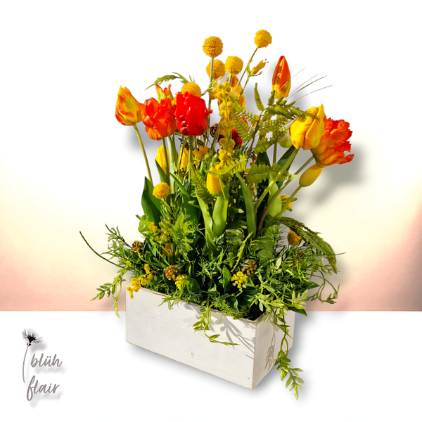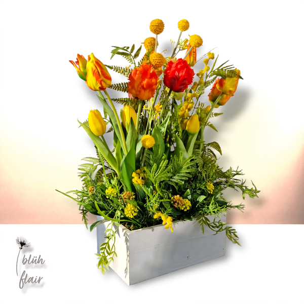 Holen Sie sich mit dem Tulpengarten den Frühling dauerhaft nach Hause und setzen Sie auf zeitlose Eleganz in einer rustikalen, altweißen Holzschublade. Dieses handgefertigte Unikat aus leuchtenden Mimosen, Allium und Farn verleiht Ihren Räumen eine besonders einladende Atmosphäre und ist ab sofort exklusiv in meinem Online-Shop erhältlich.