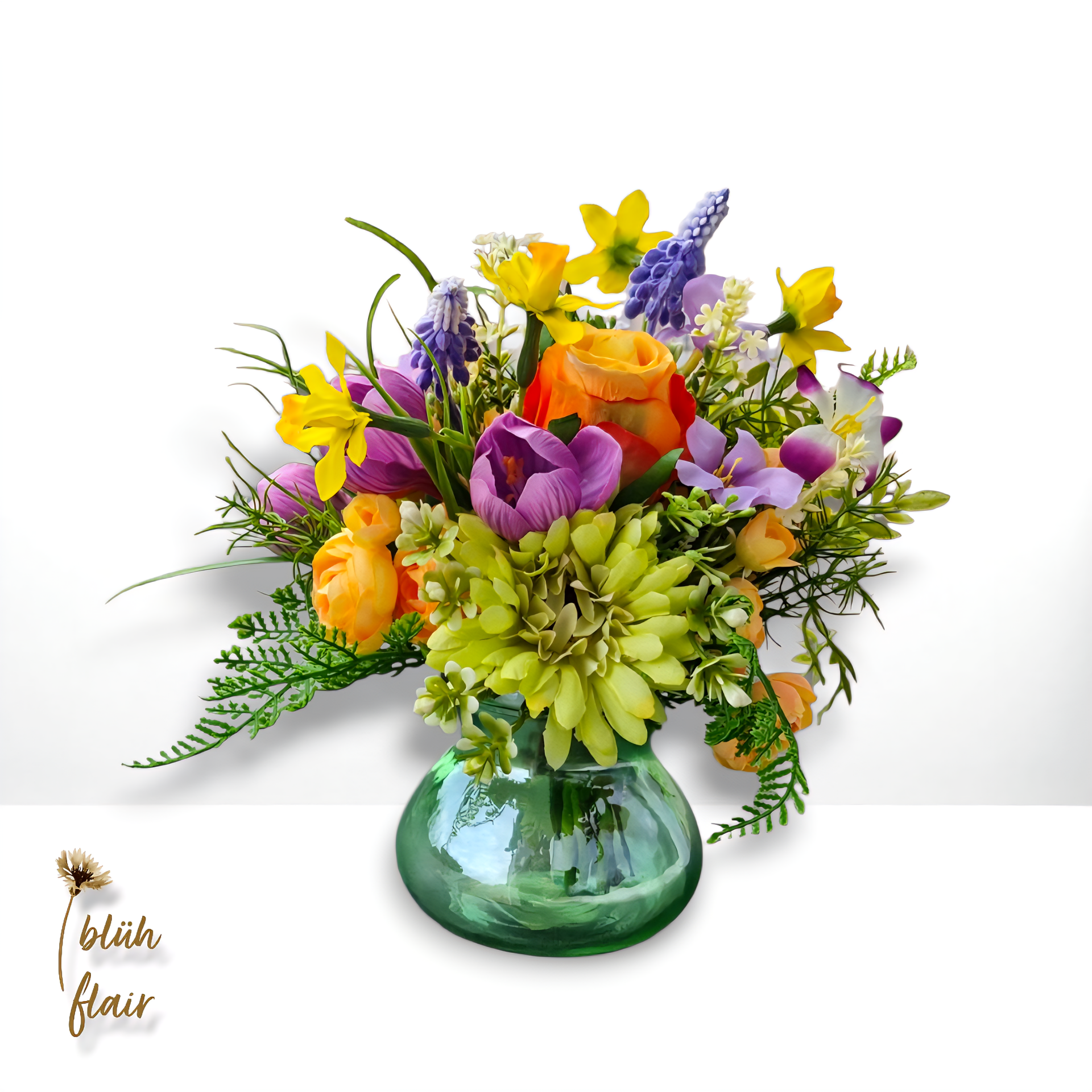 Dieses handgefertigte Arrangement aus leuchtenden Ranunkeln, orangefarbenen Rosen und frischen grünen Gerbera bringt sofortige Frühlingsstimmung in jeden Raum. Ergänzt durch lila Krokusse und kleine Narzissen, ist dieser Strauß das perfekte, hochwertige Unikat für dein Zuhause oder als besonderes Geschenk. Erlebe mit dem Frühlingsbouquet Frühlingserwachen Nr. 2 die zeitlose Eleganz naturgetreuer Seidenblumen, die niemals verblühen und jedem Standort eine vitale, einladende Note verleihen.
